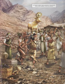 remarques: | 4ème volet de l'Ancien Testament, livres 19-1 à 40-36 19-1 troisième alliance entre Dieu et Moïse les hébreux formeront un peuple de sacrificateurs et une nation sainte, l'accès au mont Sinaï sera zone interdite sous peine de mort >> p. 8 l'Eternel, un dieu jaloux 20-7 >> p. 10/11 les commandements et ordonnances de Dieu (oeil pour oeil, dent pour dent) >> p. 12 l'ordonnance concernant les voleurs >> p. 16 Dieu exterminera les peuples qui ne marcheront pas avec les hébreux >> p. 19 les sacrifices à Dieu avec du sang (pas mieux qu'avec les idoles païennes) 31-12 >> p. 22 celui qui n'observe pas le sabbat (7ème jour de la création) sera puni de mort! 32-1 >> p. 25 Moïse absent depuis 40 jours, Aaron pressé par ses gens autorise l'édification d'un veau d'or comme nouveau dieu >> p. 28/29 à son retour, Moïse brise les tables de la loi le camp de Moïse est divisé, ses partisans (et ceux de Dieu) massacrent les idolâtres 33-2 >> p. 36 la tente d'assignation où Moïse s'entretient avec Dieu 34-14 >> p. 42/43/44/45 les nouvelles tables de la loi avec ordonnances complémentaires 35-21 >> p. 49 les instructions pour la construction de l'arche d'alliance et pour le chandelier à 7 branches >> p. 56 dernière citation selon l'album (=40-34) alors la nuée couvrit la tente d'assignation et la gloire de l'Eternel remplit le tabernacle, Moïse ne pouvait pas entrer dans la tente d'assignation parce que la nuée restait dessus et que la gloire de l'Eternel remplissait le tabernacle >> dernière citation selon la bible (=40-36) pendant leurs marches quand la nuée s'élevait au-dessus le tabernacle, les enfants d'Israël partaient, mais si la nuée ne s'élevait pas, ils différaient leur départ jusqu'au jour où elle s'élevait; aussi longtemps que durèrent les marches des Israëlites, la nuée de l'Eternel reposait pendant le jour sur le tabernacle et un feu y brillait pendant la nuit aux yeux de toute la maison d'Israël >> un album au texte toujours fidèle à la bible mais devenant vraiment barbant et peu intéressant, principalement concernant les ordonnances quelque farfelues imposées par Dieu, pas toujours très claires et parfois même contradictoires, le graphisme restant toujours acceptable quatrième album de la série qui sera probablement le dernier n.b. l'Ancien Testament, c'est vraiment la bible des juifs |