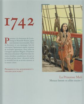 remarques: | continuation de l'aventure canadienne après avoir négocié avec le gouverneur Duquesnel (gouverneur à la jambe de bois), Kermeur obtient gain de cause, mais il doit encore assurer l'escorte de sa protégée, la princesse indienne qui doit rejoindre sa tribu pour sceller avec son père, chef de tribu l'alliance avec la France que Louis XV a conclu contre les anglais de plus Kermeur doit arrêter et découvrir l'identité de tête de fer, qui met à feu et à sang les colonies françaises de la Nouvelle France en outre, Kermeur apprend que le sire de Talmont est vivant et il doit aussi le contacter et le ramener à Quebec au gouverneur Charles de Beauharnois reprenant sa route, l'Epervier arrive à Quebec où il doit faire façe à de nombreux ennemis qui veulent éliminer la princesse toutefois, lors du départ pour les terres intérieures, le navire la Méduse est pris à partie, pour une raison indéterminée, par les canons du fort qui endommagent le vaisseau et blesse gravement la princesse tandis qu'en France, les comploteurs dans l'entourage de Louis XV et de Maurepas, son ministre de la marine, s'efforçent de semer le trouble, le chef de ces comploteurs est dévoilé, ce serait un proche de Louis XV: le vicomte de Boisgelin alors que ses complices: la comtesse de Béverac, Monsieur de Beaucourt et le spadassin Ricardo continuent leurs méfaits quant à la jolie baronne Agnès de Kermallec, prisonnière de son mari, Monsieur de Beaucourt, elle réussit par ruse à s'échapper grâce à Caroff, un compagnon de Kermeur >> l'action tire en longueur et devient même quelque peu complexe avec un prochain album annoncé en 2025: Redcoat |