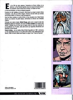 remarques: | au VIème siècle, christianisme contre paganisme en Bretagne à la cour du roi Artus, série créée dans Vécu en 1986 530 AC, la Pax Romana se désintègre, les barbares envahissent l'empire et en Bretagne Bleue (Grande Bretagne), les celtes romanisés subissent les incursions des Pictes d'Ecosse et des pirates Scots d'Irlande ainsi que l'invasion des anglo-saxons, un groupe de romains sous la direction du roi Artus essaient de s'y opposer, Kern, un jeune homme naïf veut rejoindre la cour du roi Artus, sur sa route il rencontre un mystérieux homme vert, c'est Merlin qui médite dans la forêt, finalement Kern arrive à la cour d'Artus qui l'accepte, lui donne épée et bouclier le faisant appeler Perd-Cheval qui deviendra Perceval >> aventures épiques, assez bien conçus, mais c'est surtout le graphisme de Rouge qui fait l'intérêt de l'album |