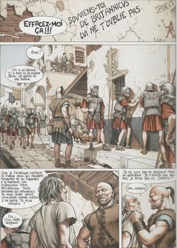 remarques: | épisode avec incursion dans le pays gaulois en l'an 62 AC, Massam mène l'enquête sur les conspirateurs qui marquent les murs de Rome avec l'inscription "souviens-toi de Britannicus" tandis que Lucius Murena qui a été privé d'Acté recherche Balba >> p. 2 les latrines publiques de Rome, une ville de 1,2 mio d'habitants en ce temps-là >> p. 8/9 le combat entre Massam et Balba dans le cloaque maxima où Balba est sauvé in extremis par la mystérieuse femme masquée au visage partiellement brûlé >> p. 13 la folie de Néron qui pense déjà à rebâtir Rome en brûlant l'ancienne Rome et en planifiant sa nouvelle villa: la domus Aurea Neronis Lucius Murena ayant appris la trahison d'Arsilia lui tend un piège, la fait parler et obtient d'elle le lieu en Gaule où Acté est séquestrée >> p. 16 la librarie grecque de Chlirfus à Rome >> p. 21 et pour se venger, Lucius supprime Arsilia et envoie sa tête à Poppée (décidément c'est une manie chez les auteurs de couper les têtes et de les envoyer comme cadeaux!) avec Balba et Evix, la femme masquée, Lucius Murena se rend à l'oppidum de Bibracte contre la promesse à son retour de soutenir Balba pour son combat contre Néron, de son côté, Massam n'est pas mort durant son combat dans le cloaque maxima, mais a été sauvé par un pêcheur et confié aux bons soins de Poppée qui déclare à Néron qu'elle est enceinte de lui et qui se plaint de Lucius Murena qui défie Néron Tigellin devient le conseiller de Néron et obtient le poste de préfet des prétoriens alors que Pétrone prend la place de Sénèque auprès de Néron entretemps Lucius Murena arrive à l'oppidum et y découvre son prochain adversaire: le druide Cervarix qui à la tête d'une armée de gaulois a attaqué le camp romain et enlevé Acté >> p. 35 l'amputation du vieux légat Sardius Priscus Agricola Evix qui est la fille de Diviciacos, un célèbre druide éduen, prend le large en délivrant un chef gaulois prisonnier des romains, Evix veut se venger de Cervarix qui a décimé sa famille Lucius Murena avec Balba et les romains retrouve le refuge de Cervarix où est détenu Acté, Cervarix est tué d'une flèche par Evix mais Acté meurt durant le combat >> album d'incursion dans le pays gaulois, ce n'est plus du tout l'atmosphère de la Rome corruptrice et intrigante, l'épisode se développe sans grande surprise, le graphisme de Delaby reste toutefois agréable sauf peut'être pour la mise en couleur mais on attend avec impatience le retour de Lucius Murena à Rome, la louve sanguinaire citation au 4ème plat: "un homme qui a connu une longue période de prospérité est sujet à toutes les catastrophes, le succès ne sait se fixer et toutes les fois que la prospérité ne peut aller de l'avant, elle fait marche arrière" Calpurnius Flaccus "demens ter trimphalis" |