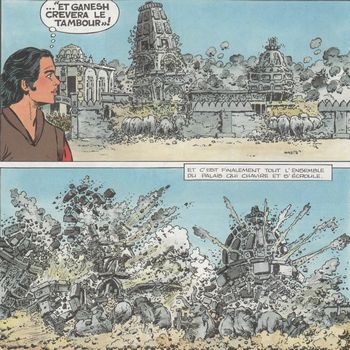 remarques: | après Rougecogne, Ardent construit avec Illioutchka un caravansérail dans la steppe asiatique, lors du passage d'une caravane, la princesse Yama d'Alampur qui s'y était réfugiée, est enlevée par des complices à la solde de l'oncle de Yama Ardent part à sa recherche vers les Indes où il fera connaissance pour la première fois avec des animaux énormes: des éléphants après bien des aventures et avec l'aide de Ganish, le dieu des éléphants, Ardent rétablira la princesse sur son trône, l'oncle ayant fait amende honorable et même devenu amoureux de Illoutchkia qui conseille à Ardent de retourner à Rougecogne >> p. 15 Ardent qui prend la trompe d'un éléphant pour un serpent >> p. 18 un étranger qui n'est pas étranger aux évènements qui se préparent >> p. 19 où Ardent est menacé par un vrai serpent >> p. 47 la force de destruction des éléphants >> scénario très moyen et graphisme qui baisse nettement en qualité n.b. depuis "l'arc de Saka", les albums suivants subissent une côte plus importante (éditions limitées?) |