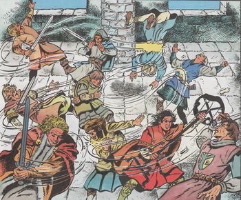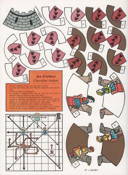 remarques: | Ardent est de retour à Rougecogne avec les richesses amassées lors de sa dernière expédition asiatique, mais la princesse Gwendoline lui manque, surtout depuis qu'elle est mariée à Youri et qu'elle élève un petit garçon >> p. 6 le pain, le miel et le vin pour le retour du chevalier prodigue >> p. 28 Bradroc mis en geôle par Ardent qui apprivoise les rats de sa cellule toutefois, lors d'une rixe avec Youri, celui-ci apprend à Ardent qu'en fait le garçon qui s'appelle Euléthère est le fils d'Ardent et non de Youri, celui-ci cède alors sa place à Ardent et se donne la mort, car lui aussi était amoureux de Gwendoline >> un scénario melodramatique, pas très fameux, le graphisme restant toutefois plutôt constant n.b. en annexe, un ex libris représentant un jeu-carton d'échec en carton à découper avec les figurines des personnages de la série dont Gwendoline en Reine, Arthus en Roi, Ardent, Bradroc et Gaudin en Cavalier |