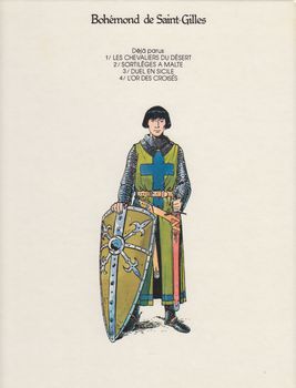 remarques: | le chevalier Bohémond et son écuyer Etienne débarquent à Jaffa et se rendent à la forteresse de Kerab de Moab où se trouvent Tancrède, l'oncle de Bohémond, la forteresse est assiégée par les musulmans à l'occasion d'une sortie, Bohémond sauve la vie d'un vieil arabe qui se révèle être un vénérable marabout qui leur remet un sauf-conduit parmi les pays arabes et un parchemin à remettre à l'abbaye de Ligugé dans le Poitou les deux compères retournent donc à Jaffa pour embarquer vers l'Europe >> premier album et premiers dessins de André Juillard, parus dans le journal Triolo du groupe catholique Fleurusédition en 1976 (qui éditait aussi Sylvain et Sylvette) >>> le graphisme est encore hésitant et le scenario plutôt faible empreint de catholicisme mais l'ensemble reste assez intéressant |