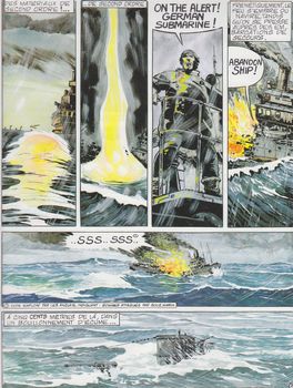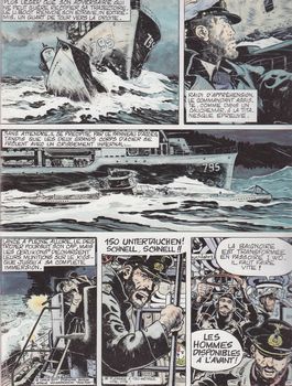 remarques: | superbe album, dédicacé par Dimitri, un des premiers albums de la série, cette fois sur la guerre sous-marine durant la 2ème guerre mondiale, Kaleunt = Kapitänleutnant zur See novembre 1942, après 55 jours de mer, un U-Boot retourne à sa base de Tromsö (Norvège) = 1800 milles en ligne droite à travers le sud islandais, le nord de l'Angleterre et les îles Shertland n.b. Seeaale = anguilles = torpilles >> p. 22 le pilonnage avec les bombes aquatiques qui explosent à proximité des sous--marins, c'était le plus grand danger pour les U-Boote le U-Boot est gravement endommagé par les bombes lancés par un bombardier Liberator et par un destroyer d'escorte, il doit prendre la fuite ne disposant plus de torpilles et il est obligé maintenant de naviguer en surface, car il n'a plus les moyens de plonger, il sera sauvé par >> p. 27 un avion Kondor, un des seuls bombardiers allemands à longue portée et il parviendra à rejoindre sa base de départ où il recevra tous les honneurs mérités n.b. orphéon = fanfare >> p. 40 selon le Kaleutn, il existe trois sortes d'hommes: les hommes vivants, les hommes morts et les marins >> p. 46 le U-Boot 200 n'aura pas le même sort, il disparaît en mer le 24.6.1943 après avoir été éperonné par un destroyer d'escorte >>> bon scénario et excellent graphisme n.b. >>> biographie Guy Mouminoux alias Dimitri voir CBD no 63 (Adèle Blanc-Sec), ainsi que dossier auteurs BD Dimitri 462D2+E |