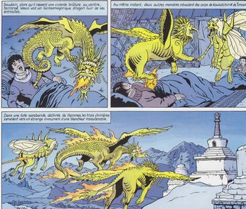 remarques: | en route vers l'Afghanistan, Vasco et Van Loo rencontrent l'esclavagiste Sikhandar sur un marché d'esclaves où ils arrachent à l'emprise de Sikhandar la jeune kirghize Koukatchin et le petit garçon Timour, fils héritier du khan mongol de Cathay qui avait été confié en son temps à la famille de Koukatchin le trio doit se rendre maintenant au monastère de Syskya pour mettre Timour à l'abri de la secte chinoise Yuan du lotus blanc qui veut supprimer Timour >> une aventure assez bien réussie de Vasco annexes - couverture de l'album - les dragons d'or de l'Hindou Kouch |