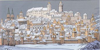 remarques: | album quelque peu hors-série apportant un résumé des aventures de Vasco Vasco Baglioni, découvreur infatigable vers 1370, semblable à Marco Polo et Ibn Battûta, Vasco est peut'être le petit-fils de Guccio Baglioni, album divisé en 4 thèmes: 1) l'Italie: Cola di Rienzo, Sienne, Rome, Venise Vasco affectionne 2 livres: "le devisement du monde" par Marco Polo et "chroniques florentines" par Giovanni Villani 2) France et Angleterre: épisode cathare, guerre de Cent Ans, Poitiers, Paris, Londres, Nuremberg (le carnaval), Bruges 3) Byzance: Rhodes, Anatolie et la belle Sophie 4) la route de la soie: Jerusalem, Ispahan, Saskya et Cathay >> un album complémentaire sur les tribulations de Vasco, ses origines et ses voyages, mais surtout un album commercial annexes - couverture de l'album - une page de garde particulière pour cet album - vue sur la cité de Nuremberg Information - Ibn Battûta (1304-1377) est un explorateur et voyageur d'origine berbère qui a parcouru près de 120'000 kilomètres entre 1325 et 1349, de Tombouctou au sud, jusqu'à l'ancien territoire du Khanat bulgare de la Volga au nord, et de Tanger à l’ouest jusqu'à Quanzhou en Extrême-Orient, les mémoires d'Ibn Battûta sont compilés par le poète Ibn Juzayy al-Kalbi en un livre intitulé communément appelé "voyages" toutefois, il faut rester prudent sur la fiabilité de ces écrits, certains historiens doutant qu'Ibn Battuta ait réellement effectué la totalité des pèlerinages et voyages relatés |
