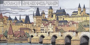 remarques: | Rome 1312, lutte entre romains et soldats du Saint-Empire dirigé par Henri VII, en 1353, Rienzo, présumé fils bâtard d'Henri VII, reprend le chemin de Rome, décidé à reconquérir la cité impériale >>> page 15 l'histoire de Cola di Rienzo réfugié dans un monastère >> petit récit historique et toujours un bon graphisme annexes - couverture de l'album - vue sur la cité de Prague Information Cola di Rienzo, connu aussi comme Nicolo di Lorenzo (1313-1354) est un homme d'état de l'Italie médiévale, Wagner, voyant en lui un restaurateur de la république romaine, lui dédia un opéra: Rienzi en 1343, il prend la tête d'une délégation et se rend voir Clément VI à Avignon pour le convaincre de rentrer à Rome, le pape refuse la proposition, mais sympathise avec lui, en 1344, il le nomme secrétaire de la Camera capitolina et lui promet d'établir un jubilé pour 1350, Cola di Rienzo comprend qu'il n'obtiendra rien d'autre et revient à Rome pour préparer sa révolution le 21.5.1347, assisté du vicaire pontifical Raymond d'Ovieto, il convoque le peuple au Capitole et se fait élire tribun et libérateur de la République, une nouvelle constitution est adoptée lui donnant des pouvoirs quasi dictatoriaux, Rienzo chasse alors les Orsini et les Colonna de la ville en prenant des mesures pour rétablir l'ordre Clément VI approuve le coup d'État, mais se méfie du rêve de Rienzo de vouloir unifier l'Italie avec Rome comme capitale, le 1er août, 200 députés venus de diverses villes d'Italie lui accordent leur soumission dès lors, le pape va appuyer le parti adverse, celui des Orsini et des Colonna qui relèvent la tête, le mécontentement va en effet grandissant à Rome, les impôts augmentent et le peuple a l'impression qu'ils servent à payer les nombreuses fêtes pompeuses et inutiles que Rienzo organise, le 15.12.1347, le cardinal Bertrand de Déaulx et les sénateurs Bertoldo Orsini et Luca Savelli rétablissent l'ancien ordre seigneurial, Rienzo n'a que le temps de s'enfuir Rienzo trouve d'abord refuge chez les Spirituels franciscains de Monte Marilla, en 1350, il se rend à Prague où il tente de persuader l'empereur Charles IV de venir délivrer l'Italie, celui-ci l'arrête et le livre à Clément VI qui le libère sur la demande de Pétrarque, Pétrarque voyait en Rienzo l'honneur des deux Brutus en 1353, les Orsini et les Colonna contestent de nouveau l'autorité pontificale, le nouveau pape Innocent VI renvoie Cola di Rienzo, accompagné du cardinal Albornoz, rétablir l'ordre à Rome, en août 1354, Rienzo rentre à nouveau triomphalement dans Rome où il se fait élire sénateur, son pouvoir reste cependant très contesté, le 8 octobre 1354, les Colonna organisent un soulèvement populaire, capturé par les émeutiers, Rienzo sera décapité, son cadavre brûlé et ses cendres jetées dans le Tibre |