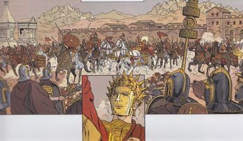 remarques: | suite de la saga de la dernière prophétie contre tout attente, Heliogabale triomphe de son ennemi Macrin tandis que les parthes continuent d'enlever de jeunes garçons le règne d'Heliogabale commence, mais c'est un empereur empreint de folie qui se fait nommer kosmocrator = empereur de l'univers >> p. 8 Heliogabale qui prêche la fornication Ganys, conseiller d'Heliogabale meurt en révélant au légat Caius Sylvius que les enlèvements de jeunes gens sont effectués par un inconnu (qu'il ne connait pas) qui utilisent les parthes à cet erffet >> p. 19 l'entrée à Rome de Ba'al d'Emèse Heliogabale fait admettre des femmes et des serviteurs au Sénat, il introduit le culte de Ba'al à Rome, Jupiter est détrôné, on est alors en 394 AC >> p. 24 les hécatombes en sacrifice à Ba'al à Rome, Heliogabale continue ses excentricités, Caius Sylvius qui mène l'enquête sur les enlèvements de jeunes garçons découvre que le coupable est Julia Soemias, mère d'Heliogabale qui les destine comme sacrifice à Ba'al mais Sylvius est assassiné avant de mettre à jour cette affaire, toutefois peu après, Heliogabale est à son tour assassiné par la garde prétorienne, Alexandre-Sévère lui succède et rétablit le culte de Jupiter un peu plus tard, le grand Constantin, un adorateur du dieu-soleil devient chrétien et abolit les dieux païens >> p. 33 la distribution de présents au peuple romain par Heliogabale et à Rome en 394, Flavien achève son voyage dans le passé, il est toutefois recherché par Stilico et doit s'exiler en Bretagne avec sa servante Marie >>> à part la partie historique sur Heliogabale, le récit n'apporte rien de vraiment nouveau mais toujours un bon graphisme de Chaillet |