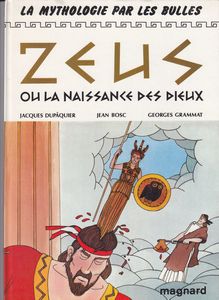 remarques: | la mythologie par les bulles, Zeus ou la naissance des dieux petits récits sur la mythologie grecque 1) l'enlèvement de Perséphone, fille de Demeter par Hadès 2) naissances de Athena (sortie de la tête de Zeus), d'Arès et de Hephaistos qui épousera Aphrodite, déesse de la beauté, cadeau de Zeus en compensation de la laideur d'Hephaistos 3) la légende de Dionysos (= né deux fois) 4) la légende de Leto qui donna Apollon et Artemis à Zeus 5) la légende de Hermès, fils de la nymphe Maia et de Zeus >> un scénario amusant et plein de fraîcheur avec un graphisme au style typique de Grammat Information dieux grecs et dieux romains: Zeus = Jupiter, Poseidon = Neptune, Hadès = Pluton, Héra = Junon, Arès = Mars, Athéna = Minerve, Artémis = Diane, Aphrodite = Vénus, Hermès = Mercure, Déméter = Cérès, Héraklès = Hercule, Dionysos = Bacchus, Ouranos = Uranus, Rhéa = Cybèle, Perséphone = Proserpine, Hephaistos = Vulcain, Cronos = Saturne, Gaia = Tellus ou Terra-Mater, tous considérés comme des traductions littérales du mot "Terre" |