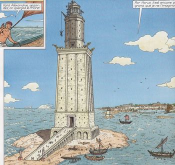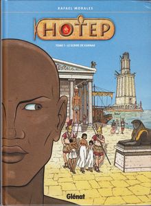 remarques: | Thèbes, 287 B.C. Hoteb, grand prêtre du temple de Karnak est au prise avec le nouveau gouverneur, Demeas, qui veut s'emparer du trésor du temple, Demeas menace d'executer Hoteb, celui-ci en appelle à pharaon et finalement Demeas périra écrasé par une statue du dieu Amon >>> p. 43 les égyptiens auraient-ils déjà connu l'emploi du boomerang? >> un pauvre album, si le graphisme de Moralès rend assez bien l'architecture antique (Morales fut un collaborateur de Jacques Martin pour les aventures d'Alix), il n'en est pas de même pour les personnages et le scenario n'est guère élaboré n.b. il y eut un deuxième et dernier album dans cette série: - la gloire d'Alexandre (2009) mais non collectionné ici |