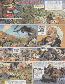 remarques: | Toussaint un noir affranchi se fait appeler Louverture et prend la tête d'un mouvement de révolte à St-Domingue (Haïti) en 1789 après bien des péripéties, il deviendra même le gouverneur de St-Domingue, mais Bonaparte qui maintient l'esclavage dans les colonies, envoie le général Leclerc avec 20'000 hommes pour rétablir l'ordre sur l'île Toussaint se réfugie dans les Mornes où il reste insaississable et ne sera capturé que par ruse, il finira ces jours au fort de Joux en 1803, malgré tout en 1804 les français seront chassés de St-Domingue qui deviendra indépendant sous le nom de Haïti >> une biographie intéressante et bien documentée, mais surtout un très bon graphisme qui ressemble quelque peu à celui de Giraud dans Blueberry |