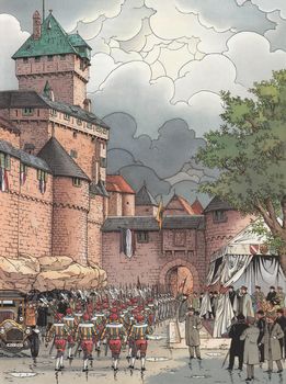 remarques: | histoire de l'Alsace supervisée par maître Jacques Martin qui affectionnait particulièrement l'Alsace volume divisé en 12 chapitres: - les romains sur le Rhin (Alsatia, Argentorate, Augusta Raurica) - l'Alsace des abbayes (répartition en Nordgau et Sundgau), - le temps des seigneurs (création du manuscrit "hortus deleciarum" = le jardin des délices = anthologie de la foi chrétienne avec 350 enluminures, malheureusement détruit lors de la guerre de 1870) - villes et châteaux - guerre des paysans - une province française (lors du traité de Nimègue en 1679) - la Révolution (départements du Rhin) - l'âge d'or de l'industrie - l'Alsace, terre allemande = Alsace- Lorraine (après la guerre de 1870), - le peintre Hansi qui ridiculise la culture allemande - la grande guerre 1914-1918 - de Koufra à Strasbourg (serment de Leclerc) - paix et prospérité >> un album plutôt remarquable et intéressant avec quelques jolies illustrations de Jacques Martin (créateur des aventures d'Alix et admirateur de l'Alsace, >> voir l'album la grande menace) annexes - couverture Ier et 4ème plat - inauguration 1908 du château de Haut-Koenigsburg par Guillaume II - automobile Bugatti devant une porte de Molsheim, ville où Ettore Bugatti installa ses ateliers |