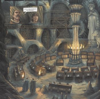 remarques: | 3ème tome, 48 pages le meurtrier de frère Thomas réussit à échapper à Gwenc'hlan, mais celui-ci découvre avec Dahud le manuscrit qui explique en partie la raison des meurtres: la recherche d'un talisman magique >> p. 9 le manuscrit qui mentionne les pouvoirs et les lieux où se trouvent les talismans magiques celtiques dont la lance de Lug et le chaudron de Dagda la légende de Talwrch continuée: il se serait emparé d'une tête humaine qui prévoit l'avenir, puis Talwrch aurait bu une potion magique des dieux celtiques qui lui a donné un pouvoir surnaturel grâce à la lance lumineuse de Lug, Talwrch en prend possession et l'utilise à son profit, puis la dépose dans une place secrète c'est probablement ce secret que les meurtriers des moines dont celui qui traduisait un ancien texte celtique, veulent s'emparer et cette lance serait cachée dans les souterrains de l'île d'Ys, une clé peut ouvrir la porte qui en donne accès et cette clé est portée par Gradlon à son cou à Ys, Gurvan, le nouvel époux de Dahud, désire célébrer leur mariage dans la maison du Christ, ceci pour protéger Ys de Rome, mais avant d'accepter, Dahud veut consulter la vieille druidesse Riwanon >> p. 18 l'histoire de la construction d'Ys à nouveau rencontre de Morrigane, la fée, en rêve avec Gwenc'hlan, elle lui révèle que les meurtriers des moines sont masqués et au nombre de sept Gwenc'hlan part alors consulter le vieux chef des druides, son ancien maître, celui-ci lui conseille de se rendre au monastère de Ninoc où des druides convertis mettent par écrit l'histoire des druides et des celtes toutefois en arrivant, Gwenc'hlan constate que le monastère a été détruit et ses occupants tués, il y découvre une entrée secrète qui donne dans les souterrains du monastère >> p. 30 la bibliothèque des druides où Gwenc'hlan découvre le 6ème manuscrit qui révèle la présence de la lance de Lug dans les souterrains d'Ys à Ys, une fête de débauche se prépare durant laquelle de mystérieux personnages s'emparent de la clé de Gradlon >> p. 39-41 la descente aux enfers et où finalement, Gwenc'hlan découvre le chef des assassins, Gurvan qui veut s'emparer de la lance de Lug mais en enlevant la lance de sa stèle, Gurvan déclanche la destruction d'Ys qui est engloutie par les flots, le moine fanatique Gwénolé salue cette destruction ordonnée par le dieu unique pour punir cette cité impie >> p. 46/47 la fin de la cité d'Ys et c'est Taran, l'assistant de Gwenc'hlan qui mettra cet évènement par écrit plusieurs années plus tard >> peut'être le meilleur album de la série de par un scénario à intrigue et soigné avec un graphisme qui reste tout à fait respectable lexique: - Aballonia = l'autre monde des celtes = Avalon - brittonique = terme s'appliquant aux langues celtiques: le breton, le gallois, le cornique et peut'être aussi le gaulois - Dagda = dieu bon = dieu des dieux en langage celtique - Dryades = petits esprits féminins protectrices des arbres et de la forêt - Duz = esprit masculin en breton - Enez Sun = nom breton de l'île de Sein - Esus = divinité celtique qualifiée d'aspect sombre et maléfique - Korrigan = petit nain, représentant du petit peuple qui vit le plus souvent sous terre - Lug = dieu suprême du panthéon celtique, nom signifiant le lumineux - Morganed = petits êtres aquatiques - Nevet = forêt sacrée ou sanctuaire - Orcanie = groupe des îles Orcades - Osismi = peuple celtique armoricain - Talwrch = prince picte qui résista à l'invasion romaine annexe - couverture de l'album - la bibliothèque des druides |