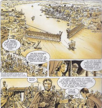 remarques: | la suite de la conquête d'Attila qui se lance d'abord sur l'empire romain d'Orient en s'emparant des portes de fer = camp fortifié de Drobeta Severin sur le Danube qui donne accès à la Dacie la Lupa, devenue femelle et animal de compagnie d'Attila, commence à conseiller Attila, notamment dans le noble jeu des échecs à l'échelle de l'empire romain >> un album bien conçu tant pour le scénario que pour le graphisme Information les portes de Fer sont un défilé de 130 km, profond de 300 m qui sépare aujourd’hui la Roumanie au nord de la Serbie au sud., le barrage construit sur le Danube a ennoyé cette route taillée à même les falaise, avec des points d’ancrages pour les poutres soutenant une charpente qui élargissait la route la tabula Trajana (vers 100 ap JC) rend hommage et glorifie les travaux réalisés par les légions romaines, la construction salue l’empereur qui a rendu sûre la navigation sur le Danube en détournant le courant du fleuve, un chenal de dérivation fut aussi construit par la legio VII Claudia, selon P. Petrovic |