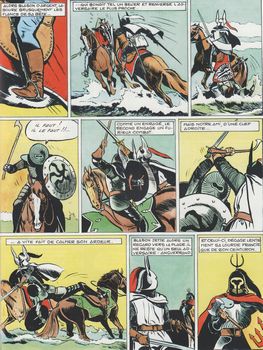 remarques: | la suite des aventures du chevalier Amaury parues dans Coeur Vaillant, toujours créées par Dimitri, mais cette fois éditées en couleur (publiées dès 1959 dans Coeurs Vaillants) 1) les 7 boucliers (nos 21 à 36 en 1963) Amaury, messager de paix du roi Louis IX pour le roi Henry III d'Angleterre doit faire façe à 7 chevaliers nobles français qui ne sont pas favorables au traité de paix 2) la légende du marais (nos 37 à 52 en 1963) Amaury chargé d'administrer la Bretagne pour le roi Louis IX parti en croisade doit lutter contre le seigneur du château des marais qui se fait passer pour un monstre nommé Gourmak >> scénario à tendance catholique (édition Fleurus), un peu moins bien élaboré que le premier volume tandis que le style de Dimitri (Mouminoux) commence de plus en plus à s'affirmer (notamment sur l'expression des visages) n.b. >>> voir CBD no 63 (Adèle Blanc-Sec) dossier et bibliographie Mouminoux/Dimitri dans cette série, il y aura encore 12 albums (scénario et dessin par Dimitri, en partie couleur, en partie N&B, dans les éditions du Taupinambour de 2004 à 2008), principalement rééditions des Samedi Jeunesse mais non collectionnés ici |