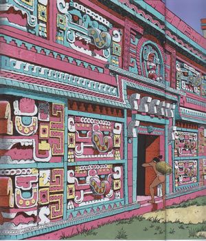 remarques: | la civilisation maya présenterait toutefois quelque analogie avec la civilisation égyptienne en 800 AC la civilisation maya est sur son déclin et doit se réfugier dans le Yucatan devant l'invasion aztèque, un de leurs derniers refuges sera Chichen Itza en 935 AC avec le roi-prêtre Quetzalcoatl ou Kukulkan les monuments de Chichen Itza: 1) el Castillo (temple du soleil flanqué de 4 escaliers centraux de 91 marches chaque = 365 marches = nombre de jours de l'année!) 2) el Caracal (observatoire qui permettait aux prêtres de connaître le mouvement des astres avec différents points de visée) 3) temple des guerriers (avec ses 1000 colonnes) 4) places de jeux de la pelote (sorte de football de grande dimension) >>> page 19 l'escalier d'une pyramide évoquant le corps d'un serpent ondulant avec sa tête en pierre au début de l'escalier le cénote = puit d'eau naturel et lieu sacré où l'on jetait des offrandes autres cités mayas: Mayapan (vers 1100 AC) et Tulum (où débarquèrent les premiers conquistadores) 1517, début de la conquête du Yucatan par Cordoba, mais ce ne sera qu'en 1545 que les derniers mayas seront vaincus >> un album toujours intéressant de par le scénario et les illustrations mais un peu moins élaboré que le tome 1 annexes - couverture de l'album (l'Observatoire à Chichen Itza) - le temple des Nonnes à Chichen Itza |