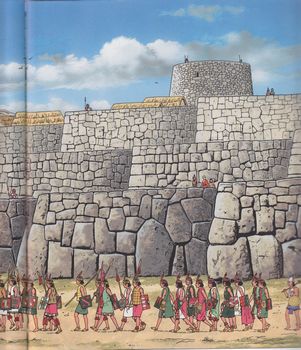 remarques: | 200 AC civilisation des Mochicas, Nazcas, Paracas, puis des Chinchas et des Incas, le malheur des Incas fut que leur pays regorgeait d'or et d'argent dont les conquistadores étaient très friands, en 1533, le dernier souverain inca Atahualpa est exécuté par les conquistadores qui seront appelés viracochas = dieux blancs par les incas 1) l'histoire des incas dont le grand roi ou prêtre = l'Inca était le fils du soleil 2) civilisation de Chavin où se trouve les plus anciens temples 3) Mochica, Nazca et Paracas, villes côtières spécialisées dans la fabrication de la céramique, tissage, métallurgie et orfèvrerie 4) Tiahuanaco (région sud) et Huari (région nord), construction du temple de Pachacamac et où se trouvent de nombreux tombeaux incas 5) Chimor en 1000 AC formation de l'état des Chimus avec les capitales Chanchan et Cuzco 6) les Incas, ce fut le plus grand empire précolombien avec une parfaite organisation sociale >> page 19 liste des rois incas de 1075 à 1572 AC 7) Cuzco surnommé le nombril du monde situé à 3500 m d'altitude, avec le temple de Coricancha et la citadelle de Saxahuaman 8) le temple du soleil à Cuzco appelé le temple Corichanca recouvert en partie de plaques d'or pour honorer les dieux et les morts 9) Machu Picchu à 2050 m d'altitude dans les Andes, un endroit admirablement camouflé dans des vallées très difficiles d'accès, découvert en 1911 par Hiram Bingan, c'était le dernier refuge inca 10)le trésor des incas était immense, entre 1530 et 1540, on estime que les conquistadores s'emparèrent de 181 tonnes d'or et de 16800 tonnes d'argent >> un bon album, mais le graphisme semble un peu moins soigné alors que le texte reste respectable annexes - couverture de l'album - la triple enceinte de la forteresse de Saxahuaman avec défilée de guerriers incas |