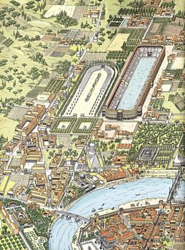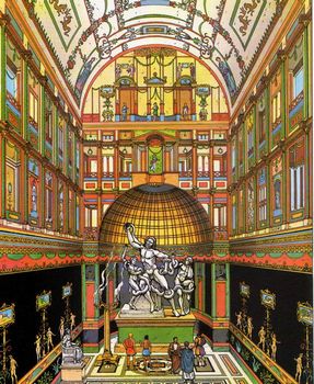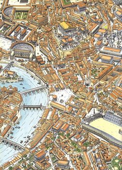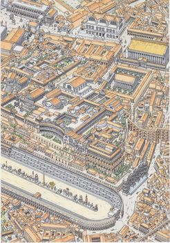 remarques: | un gros volume écrit et illustré par Chaillet - la bible de la Rome antique, un superbe album de 210 pages faisant suite à la série des "voyages d'Alix", Rome 1 et 2 par Martin, mais maintenant beaucoup plus illustré et détaillé avec de nombreuses et magnifiques illustrations et une description des quartiers de Rome sous forme de plans reconstitués quartier par quartier avec des pages doubles portant la nomenclature des monuments et des temples y inclus une petite explication à leur sujet - la Rome païenne est alors à son apogée monumentale en comptant env. un million d'habitants les sujets traités par Chaillet: 1) Rome en 314 sous Constantin, 2) la via Appia, 3) l'entrée dans Rome, 4) les thermes de Caracalla, 5) l'Aventin, 6) l'Emporium, 7) le Capitole (coeur de Rome), 8) le Forum romanum, 9) les Forums impériaux, 10) le Grand Cirque (circus maximus), 11) le Colisée (le colosseum), 12) le Palatin, 13) Subure et ses bas-fonds, 14) le Velabre, 15) l'île Tiberine et le Tibre, 16) le Transtevere, 17) le Quirinal et le Viminal, 18) l'Esquilin et le Caelius, 19) le Champ de Mars, 20) le théâtre de Marcellus n.b. les sept collines de Rome (quartiers): le Transtevere, le Janicule, l'Aventin, le Quirinal, le Viminal, l'Esquilin et le Caelius >> album de toute beauté et un "must" de l'histoire romaine n.b. après un travail titanesque (plus de 8000 heures de travail selon l’éditeur), Chaillet a aussi inclus en annexe une carte immense et dépliable (135x90 cm) avec reconstitution de la Rome impériale au IVème siècle sous le règne de Constantin annexes - couverture de l'album (grand cirque et colisée) - vue détaillée sur le grand cirque et en arrière-plan le Mont Palatin, la Domus Flaviana et Basilique de Constantin, à côté du grand cirque (circus maximus) qui était alors le plus grand cirque du monde antique, on distingue le Septizonium = gigantesque nymphée (fontaine monumentale), monument construit en 203 AC sous Septime-Sévère - vue sur les jardins de César le long du Tibre (temple Nymphée) - Champ de Mars, boucle du Tibre avec la naumachie de Trajan eet l'hippodrome Gaïanum (inconnu) - théâtres de Pompée et de Marcellus avec en haut à droite le temple de Jupiter Capitolin - vue du Panthéon le Panthéon de Rome est un édifice religieux antique situé sur la piazza della Rotonda (Rome), bâti sur l'ordre d'Agrippa au Ier siècle av. J.-C., endommagé par plusieurs incendies, il fut entièrement reconstruit sous Hadrien (début du IIème siècle), à l’origine, le Panthéon était un temple dédié à toutes les divinités de la religion antique - le nom du Panthéon est issu de l'adjectif grec pántheion qui signifie "de tous les dieux", - le Panthéon supporte la plus grande coupole de toute l’Antiquité avec 150 pieds romains soit 43,30 m de diamètre à l'intérieur qui reste la plus grande du monde en béton de ciment non armé, après presque deux millénaires, cette construction remarquable ne présente pas de signe de faiblesse de sa structure en dépit des mutilations v olontaires et des mouvements telluriques répétés - le Colisée, vue aérienne de nos jours, extérieur et intérieur, c'est le principal amphithéâtre du monde romain, le plus grand et le plus symbolique aussi, construit à partir de 70 après JC, il fut inauguré 10 ans plus tard sous le règne de Titus - la maison dorée de Neron, la salle du Laocoon |