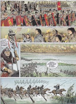 remarques: | la conquête de la Gaule par Attila qui s'empare de Metz (Mediomatricum) et Besançon (Vesantio), Attila arrive aux portes de Lutèce mais grâce à Germain, évêque d'Auxerre et à sainte Geneviève, Lutèce sera épargnée Attila remportera sa dernière victoire en s'emparant de Cenabum (Orléans) où il est arrêté par Aetius qui s'est allié avec Theodoric, roi des Wisigoths et avec Mérovée, roi des Francs tandis qu'une partie de ses troupes occupent Attila à Orléans, Aetius part avec l'autre partie à l'assaut du camp de base d'Attila mais, averti par la Lupa, Attila fait retraite vers son camp de base où se déroulera une des plus grandes batailles antiques appelée les champs catalauniques à voir: l'épisode avec la Lupa et sainte Geneviève qui n'était pas tout à fait une sainte d'après Mitton >> très bon album |