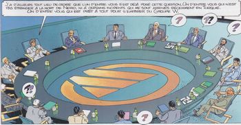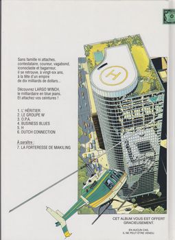 remarques: | suite du tome 1 n.b. les histoires de Largo Winch se déroulent principalement sur deux volumes explications sur les origines et l'éducation de Largo qui se sont déroulés en Suisse/Liechtenstein avec ses parents adoptifs, Ernst et Hannah (avec les costumes suisses?) le brave Largo arrivé au quartier-général de la Winch est confronté de suite par ses administrés, mais ne se laissent pas intimider, entrée en scène aussi de miss Pennywinkle et Marilyn Apfelmond >> p. 9 le coup du parapluie bulgare et Largo qui joue avec son couteau durant la réunion du big board >> p. 18 les prétentions du président Cotton (qui jouera un grand rôle par la suite) ne sont pas toujours très claires, par contre la proposition pour éviter le fisc américain en fondant une "Zukunft Anstalt" au Liechtenstein, pays qui a encore pour les finances une structure moyenâgeuse est bien imaginé pour confirmer sa position d'héritier, Largo se rend au Liechtenstein afin d'endosser les fameux papiers en blanc (= les parts de fondateur préparés par Nerio Winch) et de ce fait déclanche une chasse-poursuite entre Largo et le mystérieux assassin (qui s'avère être Cardignac), dans laquelle Simon joue le rôle d'un soi-disant traître à Largo et où les parents adoptifs de Largo font l'objet d'un meurtre gratuit selon Largo >> p. 26/27 scènes de vie folklorique en Suisse et Liechtenstein n.b. l'école technique de Bâle devrait plutôt être celle de Zurich >> p. 29 Winch, l'aventurier milliardaire qui sait jouer du couteau puis Largo se rend dans >> p. 36 l'île paradisiaque de Sarjevane dans l'Adriatique pour y récupérer ses titres de propriétaire camouflés par Nerio dans un coffre secret, c'est là que l'assassin de son père (Cardignac) se manifestera et sera une fois pour toute démasqué par Largo après une lutte épique, par la suite, l'assassin sera éliminé de façon cruel par Simon qui veut venger sa mère assassinée par les tueurs de Cardignac après coup, Largo et Simon retournent à New York pour faire façe à d'autres requins de la finance >> toujours une bonne continuation de la série, bien imaginé et captivant avec un graphisme très respectable et souvent érotique annexes - couverture de l'album - l'immeuble du group Winch à New York - la table de réunion du big board Winch |