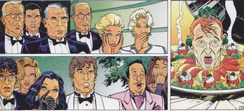 remarques: | dans cet épisode, Largo est confronté à un trafic de stupéfiants organisé par l'entremise de sa division Winchair airline (H comme Haschich) à l'aéroport d'Amsterdam, un quidam (le chimiste Sveig Larsen) est exécuté alors que Largo inaugure un nouvel hôtel Winch à Paris et fonde par la même occasion une oeuvre caritative: la fondation Winch pour les enfants victimes des guerres dans le monde rencontre avec l'attaché commercial US et l'inspecteur de l'IRS ainsi que plus agréable avec la baronne Vandenberg >> p. 9 avec en plus la présentation du plat du chef (et ce n'est pas une tête de veau) entretemps un nouveau attentat est dirigé contre Largo Winch, flash back (rétrospective): Largo se trouve dans le triangle d'or (Birmanie, Laos et Thaïlande) en prise avec un seigneur de la guerre, à cette occasion il sauve la vie de Sveig Larsen, un chimiste et spécialiste de la fabrication d'héroïne, c'est l'homme qui vient de se faire abattre à l'aéroport d'Amsterdam et qui est présenté comme plat du chef, un avertissement à Largo inculpé dans le meurtre de deux inspecteurs de la police française, Largo se trouve également soupçonné par la DEA (drug enforcement administration = US bureau of narcotics), d'être à la tête d'un important trafic de stupéfiant, il doit prendre la fuite et se cacher momentanément tout en s'occupant personnellement de cette affaire dont le chef fait probablement parti du groupe Winch >> p. 29/30/31 petit exposé du trafic de drogue (opium, morphine, héroïne) par l'inspecteur de police hollandais après de nombreuses péripéties, Ovronnaz apprend à Sullivan que Largo avait découvert un trafic de stupéfiant qui utilisait la Winch Airline pour transporter leur marchandise d'Europe aux USA et que Largo s'était mis sur la piste du chef de ce trafic qui devait être un des présidents du groupe Winch >> toujours un bon scénario, décidément van Hamme est un maître du genre avec un bon graphisme de Francq et selon Simon, le prochain épisode risque d'être pas mal gratiné n.b. page de garde: Joe Sullivan n'est plus mentionné, mais reste conseiller personnel de Largo Winch annexes - couverture de l'album - le plat du chef |