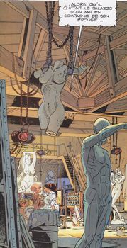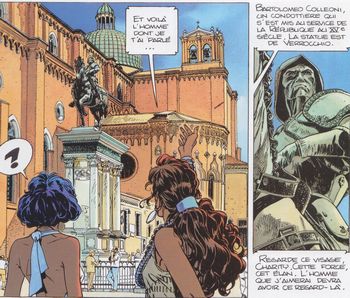remarques: | à Londres, un certain mr. Brown offre à mr. Haynes, un ancien militaire, 500'000 livres sterling pour une opération secrète à Venise, un fugitif est abattu par des malfrats mais réussit auparavant à transmettre un fax à Largo Winch qui fait du tourisme à Paris avec Charity Atkinson mais il est déjà épié - réapparition de Charity Atkinson, l'amie de Largo (Istamboul) - apparition de Domenica Leone, sculpteur à Venise, amie de Charity - apparition du duc Francesco II Leridan, surnommé le doge, avec ses trois fils Gianbatista, Silvestro et Vitale - apparition du majordome Tyler = Mr. Haynes après coup, Largo retourne à New York et Charity se rend à Venise chez son amie-sculpteur Domenica Leone qui, elle, reçoit entretemps la visite musclée d'un commando des CCR (cellules combattantes révolutionnaires) mais elle réussit à bien s'en sortir (une fameuse lutteuse!) >> p. 10 un pauvre petit garçon riche >> p. 11 la traversée des Alpes par Charity >> p. 12 l'atelier de Domenica Leone >> p. 18 le majordome Tyler (de la gentlemen's gentlemen school de Regent Street), engagé par miss Pennywinkle au service de Largo pour le rendre plus gentleman >> p. 25 à 28 l'exposé sur le pétrole et sur l'OPEP présenté par Jaramale, président de la division pétrole du groupe Winch, la Woilco qui est menacée par la CASPE (cartel agreement secret protection entity), dirigée par une ancienne connaissance, Robert Cotton, qui hait Largo Winch et qui fait la loi sur le marché du pétrole concernant les royalties payées par les sociétés pétrolières toujours à Venise, le duc Francesco, surnommé le doge, un mécène qui organise une soirée de carnaval en faveur de sa fondation "sauvez Venise" pour recevoir des dons et pour augmenter ses "dons", il fait enlever certains potentats contre rançon sous l'identité du groupement terroriste CCR suite au message reçu par le fugitif décédé et après une série de meurtres dans ses bureaux dont une course-poursuite sur la terrasse du building Winch, Largo décide de se rendre aussi à Venise >> p. 29 la fille dans le placard >> p. 38 le coup du parasol contre l'agresseur par Tyler, surnommé le pinguin lanceur de parasol par le lieutenant de police genre Colombo arrivé à Venise, Largo avec Domenica Leone assiste impuissant à l'enlèvement de Charity mais Largo est prêt pour le second round, même si il doit en mourir n.b. l'opération secrète arrangée par Haynes commanditée par Brown était de faire exploser le building Winch lors de la visite des négociateurs indonésiens pour le pétrole (Brown = probablement Cotton ou Jacopo, l'intendant du duc Francesco) >> un album au scénario plutôt carnavalesque mêlé d'érotisme comme d'habitude, un peu moins élaboré que les albums précédents mais qui reste toujours intéressant avec un graphisme bien exécuté annexes - couverture de l'album - l'atelier de Domenica Leone - le phantasme de Domenica Leone, p. 43: le condottiere Bartolomeo Colleoni Information Colleoni fut effectivement un condottiere italien du XVème siècle ( 1395-1400 à 1475) sous les ordres de Carmagnola, toujours au service de la Sérénissime, Colleoni participa entre autre à la guerre entre Venise et Milan en se distinguant, le 17.10.1431, dans l'attaque de Crémone qui fut, par contre, fatale pour son commandant Carmagnola Francesco Bussone da Carmagnola (1385-1432) dit Carmagnole Carmagnola était un grand et célèbre condottière aux origines humbles: il fut berger et réussit avec courage et, plus encore, avec génie, à gravir rapidement tous les échelons de la carrière militaire, au point d'aider Philippe Marie Visconti à reconquérir le duché de Milan et à être à la fois admis dans la maison Visconti par un mariage et élevé au rang de comte de Castelnuovo, Carmagnola fut l'un des rares condottières qui réussirent à vaincre, à Bellinzona (bataille d'Arbedo en 1422), le célèbre carré suisse, en utilisant une tactique particulière: il ne lança pas, comme d'usage, la cavalerie contre la formation suisse ramassée comme un porc-épic, mais, après s'être mis à l'abri de cette formation, il fit démonter les cavaliers pour l'attaque finale, les transformant en fantassins cuirassés inattaquables qui massacrèrent les Suisses, ce fut une nouvelle gloire qui s'ajouta à celle déjà acquise et suscita ces jalousies |