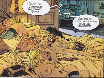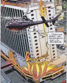 remarques: | Largo a affaire cette fois au monde des médias, du jeu et de la prostitution - apparition et disparition de Sarah Washington - apparition de Flor de la Cruz, productrice-entraîneuse - de la petite Juliette du Wyoming, pauvre petite prostituée - Panatella, alias don Candido, le grand manipulateur l'histoire du feuilleton TV "Golden Gate" avec Simon Ovronnaz comme principale vedette (le Bogart en Borsalino) avec un contrat comportant une clause de mécanisme d'évasion fiscale (sur un compte bancaire des îles Caymans nom de code "shadow") et une belle black, Sarah Washington, employée du groupe Winch chargée d'enquêter sur ces virements bancaires, qui disparait sans laisser de traces >> p. 5 on emploie encore des cassettes VHS dans le groupe Winch (an 2000) >> p. 9 la villa-paradis de la vedette Simon >> p. 12 la révélation sur l'affaire financière de la W9 (chaîne de télévision du groupe Winch dirigée par le président Waldo Buzetti, division TV&Radio networks et du directeur Earl Quinn de la W9) ainsi que le coup de l'assurance vie sur la personne de Simon, arrangé par Flor de la Cruz, productrice du feuilleton Golden Gate >> p. 13 mais quand même un drôle de contrat avec l'avenant no 2 signé après coup et oublié d'avoir été annoncé par le directeur Quinn visite de Largo chez don Candido, propriétaire du plus grand palace-casino du Nevada à Reno, affilié à la mafia et agissant pour le compte de Ned Baker, propriétaire de la chaîne de télévision NBN (ned baker network), principal concurrent de la W9 >> p. 25 les salons de jeux du building Guantanamera >> p. 27 un traitement sadiste sur la belle black Washington, prisonnière de don Candido et enfermée avec des rats entretemps, Simon s'amuse et piège le puritain Cochrane (p. 30) tandis que Freddy, le pilote, raconte une partie de sa vie et que Largo joue le défenseur de petite jeune fille naïve avec Juliette des esprits qui veut quitter l'emprise de don Candido et qui révèle à Largo le gigantesque trafic de femmes pour la prostitution dont les séances de film "snuff movies" (femmes torturées et égorgées en direct devant la caméra), le tout organisé par don Candido, son associée Flor de la Cruz et de leur homme de main, l'affreux Arturo >> p. 38 à 41 l'épisode de la fuite à la cow boy et Juliette qui fait pipi dans sa culotte mais ce sera à nouveau Largo qui se fera piéger, car Juliette des esprits agissant pour le compte de don Candido accuse maintenant Largo de coups et blessures avec viol sur jeune fille mineure tandis que Cochrane, filmé dans la banque Cayman et surpris avec une valise remplie de dollars, est arrêté pour évasion fiscale envers le fisc américain tous deux se retrouvent sous les verrous, l'un pour délit criminel, l'autre pour délit d'évasion fiscale, mais connaissant Largo Winch, on sait que celui-ci saura se tirer d'affaire >> des aventures cette fois plutôt burlesques et donquichottesques, genre "boulevard de sensation" , mais avec une action menée tambour battant et un graphisme toujours de bonne qualité annexes - couverture de l'album - l'enfer du jeu au Guantanamera (titre tiré de la chanson de Jo Dassin) - Cochrane le puritain piégé par Simon |