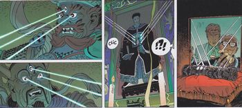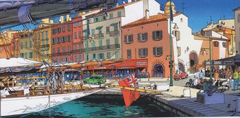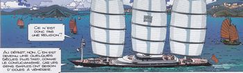 remarques: | page de garde: Gus Fenimore est le nouveau président du département sport&entertainment à noter: - les régions françaises parcourues par Largo: Nice, St-Tropez et l'aéroport de Hyères - réapparition de l'hollandaise Majan Texel et de sa petite amie Willeke affaires chinoises pour Largo Winch qui doit honorer la parole donnée en son temps à la triade des gardiens de Tao, à cet effet il s'envole avec Simon (qui lui est redevable de cette parole) pour HongKong où il doit aussi parachever un accord commercial avec son groupe aeronautiques et une société chinoise la Tsai Industries Corporation dirigé par le vieux Tsai et son fils Tsai Lee, mais toute cette affaire n'est qu'un piège que l'on tend à Largo entretemps il aura eu une échaffourée avec des chinois à Saint-Tropez ce qui le conduira à une chasse-poursuite dans les ruelles de St-Tropez entre une Smart et une Renault R4 (>> p. 14 à 17) >> p. 19/20 les origines des démêlés de Largo avec les autorités chinoises au Tibet et la fuite à travers l'Himalaya avec le détenu Tan Ming T'Sien >> p. 21 l'escale à Dubai et à Hong Kong >> p. 24 l'hôtel Blue Lotus du groupe Winch à Hong Kong avec suite impériale et table VIP à Hong Kong, Largo est contacté par une fausse triade à la solde du vieux Tsai qui lui demande de voler le précieux manuscrit ancien de Lao Tseu " le daodejing", déposé dans le coffre-fort privé de monsieur Tsai lors d'une invitation sur l'île paradisiaque de monsieur Tsai, Largo essaiera de subtiliser ce manuscrit, mais se fera piéger par les sbires de Tsai qui le remettent ensuite à la police chinoise au Tibet en compagnie de son ami Tan Ming T'Sien qui a été torturé et assassiné >> p. 29 le supplice de Tan Min T'Sien détenu comme otage par la fausse triade >> p. 33 théorie sur le taoisme et le yin&yang sur un yacht moderne avec voiles électriques à la chinoise >> 33-35 l'ouverture du coffre-fort de Tsai par l'action conjuguée des trois yeux des gardiens du Tao: Wang Lin général du ciel et Zhen-Wu, le dieu du nord >> p. 37 la vieille petite madame Choo, intendante de monsieur Tsai >> nouvelles aventures orientales pour Largo Winch qui cette fois se trouve dans une situation désespérée soi-disant au Tibet, scénario assez bien imaginé et graphisme toujours respectable bien qu'un peu moins soigné annexes - couverture de l'album - le port de St-Tropez à la Largo Winch - le sampan moderne - les trois yeux des gardiens du Tao |