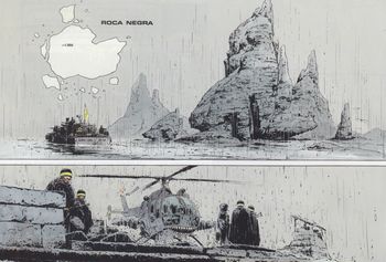 remarques: | à Roca Negra, XIII est torturé par le colonel Peralta >> p. 4 les uniformes à la sinistre tête de mort et >> p. 8 l'hélico-requin avec la visite du trio spécial de la Croix Rouge internationale: Miss Honeychurch = Jones, Mr. Peztalozzi = le marquis et Miss Janssens = Betty qui se découvre une passion pour le lance-missiles de la forteresse et pour faire diversion, après l'attaque de Roca Negra par les santosistes, évasion quelque peu rocambolesque de XIII et Maria >> p. 16 c'est vraiment el Cascador-cascadeur mais l'opération des rebelles est un succès, Puerto Pilar, la capitale, tombe en leur pouvoir, Ortiz est exécuté et Felicidad capturée alors que Peralta réussit à rejoindre des troupes fidèles dans le nord du Costa Verde, toutefois XIII est à nouveau arrêté, cette fois par les santosistes de Jorge de los Santos qui accuse XIII d'imposture et de trahison rencontre de XIII avec Sean Mullway qui lui raconte >> p. 26 coup de théâtre un peu ironique, l'arrestation d'El Cascador qui ressemblait quelque peu au Che Guevara régional (>> voir p. 30) >> p. 28 la romance entre Maria de Los Santos et d'El Cascador, Jorge de los Santos promet de laisser partir XIII et ses amis contre une attestation signée par XIII qui reconnaît avoir été un traître XIII accepte mais en dernière minute, décide de rester au Costa Verde pour faire éclater la vérité lors d'un procès populaire >> p. 39 à 46 le curieux procès de Jason MacLane, défendu par Sean Mullway qui réussira à dénoncer la culpabilité de Jorge de los Santos qui a trahi la cause des Santosistes en monnayant les trésors minéraux du Costa Verde et en ayant voulu écarter ses concurrents du pouvoir, notamment El Cascador; >> p. 42 la déclaration sincère du capitaine Garcia démasqué, Jorge n'a pas d'autre alternative que de se donner la mort, Maria Isabel devenant la présidente provisoire de la République Socialiste de Costa Verde dernière page XIII alias Jason Fly, alias Jason MacLane apprend la vérité sur ses origines, notamment que Sean Mullway est son père génétique bien que XII ait été éduqué par Jason Fly et les détails des origines de XIII seront traités dans le prochain album: "trois montres d'argent" >> un album plutôt intéressant malgré les exploits rocambolesques de XIII qui cette fois commence à entrevoir l'origine de son identité, mais tout n'a pas encore été dit et tout ne sera pas encore dit annexes - couverture de l'album - le lieu pittoresque de Roca Negra |