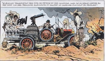 remarques: | apparition de nombreux nouveaux personnages: l'histoire de la famille irlandaise O'Keefe dans laquelle trois irlandais (Liam Mac Lane, George Mullway et Jack Callahan) épousent trois irlandaises, les filles de O'Keefe (Jenny, Kate and Beth) et reçoivent trois montres d'argent comme cadeau de mariage à Brooklyn, la guerre fait rage entre les irlandais du clan O'Keefe et les siciliens du parrain Don Vitale, les trois frères irlandais éliminent le parrain, mais doivent s'exiler et rejoignent la révolution mexicaine, George et Jack y trouveront la mort alors que Liam débarque au Costa Verde, petite république sud-américaine, et devient prêtre dans un monastère pour tout oublier, il se manifestera à la fin de sa vie en écrivant à son fils Tom Mac Lane >> p. 12 Sean Mullway dans ses explications tient à son verre de vin >> p. 15 Tom MacLane meurt sur la rivière Kwai et ce sera Sean Mullway qui réceptionne la lettre de Liam MacLane entretemps, Pasquale Giordino, neveu de Don Vitale, prend le contrôle des affaires des trois veuves irlandaises par la suite, Frank Giordino, fils de Gianbatista, cousin de don Vitale, qui déteste les irlandais abat sa soeur accidentellement en voulant viser Sean et celui-ci, accusé du meurtre, doit aussi s'exiler vers le Mexique, il en profitera pour rechercher sur la base de la montre d'argent qu'il a reçue les deux autres montres sur lesquelles sont gravés séparément les signes secrets qui indiquent où le trésor, estimé à 10 mio de dollars, a été caché >> p. 26 les 100'000 pesos-or de Maximilien et leur cachette dans un lieu secret gravé par un signe secret sur les trois montres, symbole qui n'est lisible qu'en combinant les trois montres >> p. 22 à 40 la longue histoire des trois irlandais exilés au Mexique avec l'histoire des origines de Jason MacLane élevé par Margareth Mullway, soeur de Sean et adopté par Jonathan MacLane à la mort des femmes irlandaises au Costa Verde, el Cascador reprend du service contre les troupes du colonel Peralta qui marchent sur la capitale Puerto Pilar et XIII avec l'aide du major Jones réussira à anéantir les troupes de Peralta après le succès de leur mission et après que XIII ait quitté son épouse et amour Maria, XII et Jones sont rappelés aux USA pour raisonner leur vieil ami, le général Carrington qui semble être devenu subitement fou, reste encore aussi deux montres d'argent à retrouver et à déchiffrer les inscriptions gravées sur elles >>un album de 56 pages très explicatif sur les sources de XIII, l'album étant pratiquement entièrement voué aux origines de XIII et à l'aventure mexicaine, toujours avec un excellent texte et un graphisme bien exécuté n.b. Mullway tel père, tel fils (la fuite du père après avoir été soupçonné d'avoir tué sa femme Carla Giordino et la fuite de XIII après avoir été soupçonné de tuer son père Jeremie Rowland) - les différentes identités de XIII: Steve Rowland, Jake Shelton, Ross Tanner, Jason Fly, Jason MacLane, Brian Kelly, El Cascador) - l'organigramme irlandais: les trois filles O'Keefe 1) - Jenny qui marie Liam Mac Lane 2) - Kate qui marie George Mullway 3) - Beth qui Jack Callahan 1) leur fils Tom marie Audrey et ont un fils: Jonathan MacLane (né 1930) 2) leur fils Francis marie Mary et ont 2 enfants: Margareth et Sean Mullway (né 1935) 3) leur fils Jimmy (mort à 4 ans) et leur fille Deborah qui marie Gianbatista Giordino, ils auront deux enfants: Frank Giordino (né 1937) et Carla Giordino qui marie Sean Mullway, de cette union naît Jason en 1961 (donc âgé maintenant de 34 ans) qui devrait normalement s'appeler Jason Mullway annexes - couverture de l'album - le clandes irlandais - l'auto-mitrailleuse mexicaine |