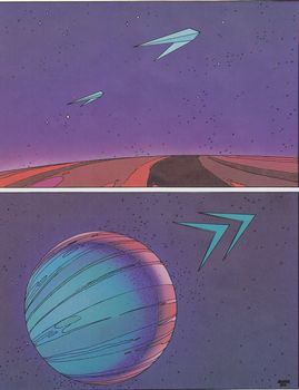remarques: | un album créé pour Citroën - en prologue, très bon résumé de la vie et de l'oeuvre de Moebius/Gir avec les origines de l'album Citroën (voir aussi CBD no 58 Auclair). - la vedette de l'album, la Citroën 15CV traction avant, avec Citroën en route pour Edena, le paradis céleste >>> page 36/37 le vaisseau spatial qui dès son envol prend la forme des fameux chevrons Citroën >>> un scénario simple mais qui tient debout et surtout un superbe graphisme avec une magnifique couverture |