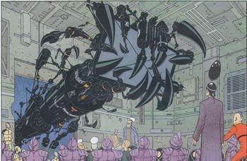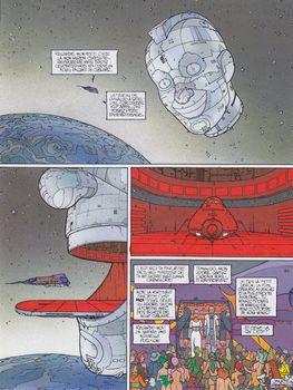 remarques: | le plan de Louz et Difool commence bien avec l'appui des anarco-psychotiques, mais le supra-ordinateur leur a tendu un piège, il oblige Difool à renoncer à faire connaître le scandale des homeoputes et ordonne à Louz de concubiner avec Diavoloo pour donner plus de poids envers le public Diavoloo organise avec Louz une sauterie dans son harem-satellite tandis qu'on efface la mémoire de Difool par une opération au cerveau, Difool amnésique, on lui rend son oiseau Deepo et on le renvoie dans son conapt (= logement), par la suite, Difool trouve son réconfort avec du ouiski, du SPV (petite drogue) et des homeoputes >>> page 50 la sélection des homeoputes directement faite par le consommateur le père de Louz est envoyé en exil sur la planète-jungle Odiozona avec comme mission d'enseigner aux gorilles chauves aborigènes la consommation du ouiski, du SPV et du super-heronium, "tête d'escargot" disparait de la circulation (c'était le mouchard) et Kolbo-5 se fait exploser par sentimentalité final: Animah et Tanatah sont contactés par les Incals pour sauver le monde et ils demandent à Animah de se faire féconder par Difool, promis à un grand destin, pour engendrer le sauveur du monde = Solune >> ouf c'est fini = avant-dernier album de la série qui se termine un peu en queue de poisson, le scenario est cette fois complètement débile quoique restant quelque peu intéressant mais on aurait pas dû encore insister pour produire un dernier album en 1995 Si le début de la série "avant l'Incal" avait encore un certain charme, la fin devient vite lassante, même le graphisme de Janjetov est moins élaboré |