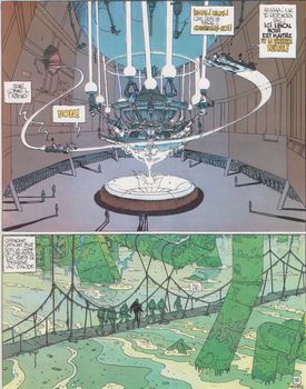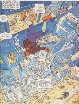remarques: | les aventures de John Difool, détective privé de classe B avec son oiseau Deepo premier album de la première série, divisé en épisodes 1) les nuits de l'anneau rouge où Difool reçoit l'Incal lumière 2) le bal de l'Incal, Difool est pourchassé par de nombreux groupes qui veulent s'emparer de l'Incal lumière, Difool le cache dans son oiseau mascotte = milou de Difool = la mouette-béton Deepo 3) son ophidité majeure = le président Prez qui se fait clôner, dans sa fuite Difool arrive à la cité Technos (contrairement à Milou, Deepo peut maintenant parler grâce à l'Incal lumière) 4) techniques Technos, la cité Technos où les cadavres sont récupérés par le bio-réparateur pour alimenter le grand pondeur d'oeufs sombres, Difool est capturé 5) le meta-baron, tueur et chasseur de têtes, est convoqué par Tanatah, reine de l'Amok pour récupérer Difool, Tanatah détient Solune, fils du meta-baron, comme otage et monnaie d'échange >> ce premier album réussit un bon lancement de la série, un genre original brillamment dessiné par Moebius malgré un scénario quelque peu excentrique de Jodorowsky n.b. terminologie SPV = hallocigène léger de consommation courante conapt = logement cogan = arme à feu annexes - couverture de l'album - le grand pondeur d'oeufs d'ombre - la chute de Difool dans Suicide Allee |