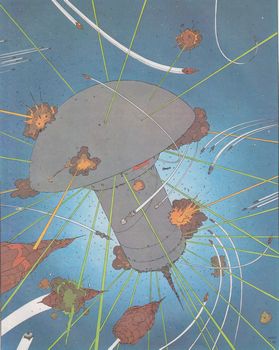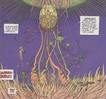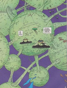 remarques: | 1) Vitavil H20, Raïmo et ses amis sont exilés sur la planète-prison Aquaend, composée uniquement de matière liquide, au fond de l'eau se trouve la cité aquatique de Vitavil H20 où se trouve le véritable imperoratriz (qui n'était à l'assemblée galactique qu'une projection holographique), sur le vaisseau-étoile, l'Incal apprend que la solution pour éliminer l'oeuf d'ombre se trouve sur Aquaend 2) la stratégie des méduses, Difool contacte l'imperoratriz et l'informe selon l'Incal que le seul moyen d'éliminer les oeufs d'ombre est de provoquer une mutation des méduses géantes 3) Difool reçoit la mission de rallier les forces Breg pour combattre les forces de la ténèbre, il doit se rendre à la compétition millénaire et sacrée de la fécondation quinquénaire de la protoreine Barbarah sur la fourmilière-matrice de la planète Berg >> pages 40-41-43 la planète Ourgar-gan des Breg et la fourmilière-matrice 4) noces royales, parmi de nombreux concurrents, Difool réussit à féconder la protoreine, Difool devient roi et les Breg s'allient à l'imperoratriz 5) virus tenebrae, les méduses détruisent les oeufs d'ombre et la flotte Breg anéantit Technogea, la victoire est complète, mais la ténèbre n'est pas éliminée et réussit grâce à un traître à inoculer le virus tenebrae à l'imperoratriz qui est transformé en oeuf noir la lutte continue >> cette fois c'est vraiment un album magnifique tant pour le scenario que pour le graphisme |