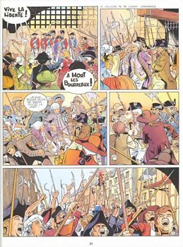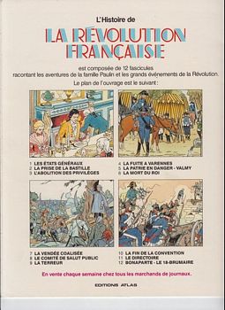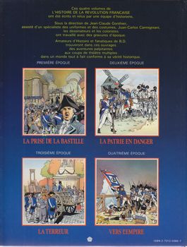 remarques: | début d'une série de 4 albums dessinés en alternance par Ruffieux et Goepfert, n.b. cette série a aussi paru en 12 fascicules première époque chronologie 1788 montée des prix et disette dans le royaume de France, histoire de deux familles: l'imprimeur Paulin et le noble baron d'Esny 5.5.1789 réunion des Etats Généraux à Versailles 16.6.1789 constitution de l'Assemblée Nationale 20.6.1789 serment du jeu de Paume 12.7.1789 l'exil de Necker provoque la révolte 14.7.1789 prise de la Bastille 4.8.1789 fin des privilèges de la noblesse et du clergé 6.10.1789 déclaration des droits de l'homme 14.7.1790 fête de la Fédération au Champ-de-Mars >> petit resumé sur la Révolution Française et son développement, assez bien présenté par Castellar et bien dessiné par Ruffieux annexes - couverture Ier et 4ème plat de l'album - les 12 fascicules - prise de la bastille |