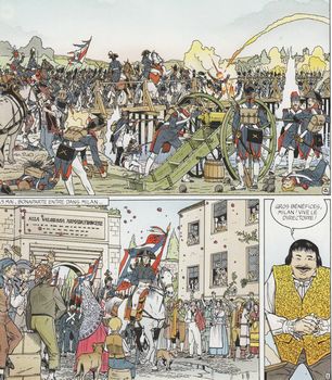 remarques: | tome 4, vers l'Empire quatrième période chronologie 20.5.1795 soulèvement de la Commune de Paris qui est réprimé par les Gardes nationaux, mort de Louis XVII 22.8.1795 nouvelle constitution avec l'assemblée législative = Conseil des 500 et directoire executif de cinq membres 4.10.1795 complot de Babeuf, Bonaparte réprime un soulèvement royaliste avec l'aide des troupes de Murat 1796-1797 victoires de Bonaparte en Italie 4.9.1797 Bonaparte dissout le Conseil des 500 et forme un nouveau directoire mars 1798 6 républiques: république française, république batave, république helvétique, république cisalpine de Milan, république ligurienne de Gênes, république parthénopéenne de Naples juin 1798 campagne d'Egypte (financée par les millions pillés dans le trésor de Berne) 16.5.1799 Sieyès entre dans le Directoire 9.10.1799 Bonaparte revient d'Egypte 1.11.1799 Bonaparte forme le Consulat en s'alliant avec Sieyès >> dernier album, toujours aussi intéressant Information A) muscadin, utilisé sous la Révolution pour désigner un royaliste qui affecte une mise excentrique B) plus de six cent milliards de francs: voilà ce que représenterait aujourd’hui le trésor de Berne si Napoléon, à la tête des armées d’invasion du Directoire, ne l’avait dérobé aux patriciens de la ville en 1798 et emporté pour financer entre autres sa campagne d’Egypte et les soldats français ont non seulement mis la future ville fédérale à sac, mais, humiliation suprême, en ont aussi volé les ours |