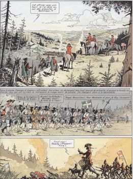 remarques: | Benjamin, Billy, Louise, Julia et son mari arrivent dans la vallée de Susquehanna peuplée par les "Amish" (réformés allemands ralliés à la théorie de Penn = quakers installés dans l'actuelle Pennsylvanie = terre d'accueil pour tous les persécutés), Louis met au monde un fils Guillaume, n.b. le champ d'en haut = la maison des Graindal Billy quitte ses amis et arrive à Salem (la puritaine) où il sauve la vie de Thimoleon un vieux trappeur un peu fou, et son fils indien Bee Bee Gun >>> page 26 le supplice du tourniquet Thimoleon parle alors à Billy de la fameuse vallée bleue, une vallée inconnue où tout est à profusion, un vrai paradis, Billy décide d'aller chercher ses amis, sur le chemin du retour, il sauve accidentellement la vie du général anglais Wolfe durant une bataille >> un scenario et un graphisme très acceptable |