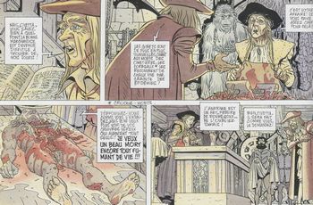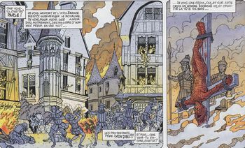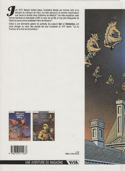 remarques: | prélude à la Saint Barthélémy, Margot doit épouser Henri de Navarre, mais Catherine de Medicis tend un piège aux protestants, Margot la bleue sur la demande de Henri de Navarre, réfugié chez elle, part avec Arcines, son père, qui a été ressuscité, pour Paris rejoindre Civetta, une amie de Arcines afin de prévenir la mère d'Henri, Jeanne de Navarre, appelée aussi la reine de fer ou la chèvre des Pyrénées d'une tentative d'assassinat Arcines et Civetta ont été tous deux des disciples de Leonardo de Vinci d'où le nombre d'inventions qui leur sont attribuées dont l'aile artificielle qui permet parfois à Margot de voler pour s'enfuir de situations difficiles (voir la couverture du premier album) la tentative échoue et tous les trois se retrouvent emprisonnés >> les aventures de Margot la bleue continuent sans grand éclat, graphisme de Son respectable, mais scenario de Dimberton plutôt faible annexes - Ier et 4ème plat de l'album - l'autopsie de la magicienne Civetta - le massacre de la Ste-Barthélémy et martyr de Saint Nathanaël, par les romains et connu aussi sous le nom de Barthélémy |