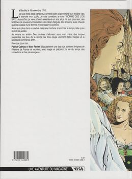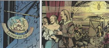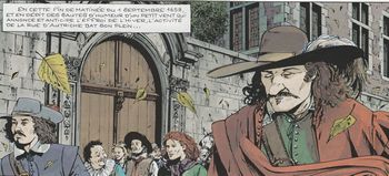 remarques: | série masque de fer, avril 1991, sans la page de garde aux portraits il est signé du dessinateur Marc-Renier et du scénariste Cothias avec l'unique participation pour ce premier album de Annie Gouëdard ou Gouédard, actrice de plusieurs livres sur les arts martiaux, mais peu connue dans la bande dessinée début d'une série historico-artistique, elle fait partie du cycle des sept séries: 7 vies de l'épervier, masquerouge, plume-aux-vents, fou du roy, coeur brûlé, Ninon secrète et masque de fer, on peut lire cette série séparément, mais il vaut mieux commencer par le fou du roy et ninon secrète n.b. les couvertures d'album de cette série sont signées par Marc-Renier et sont toutes de bonne qualité la Bastille,1703, le masque de fer "celui que l'on sait" se souvient: Paris 1658, le jeune roi Louis XIV est bien malade, son jeune frère Philippe d'Orléans s'en réjouit, car il est le prochain sur la liste royale les comédiens dont Molière jouent "Nicomède" de Corneille devant le jeune roi >> p. 8 apparition du jeune Jean-Baptiste Donjon qui romp avec son père tapissier pour devenir comédien (il reprend le même développement que Jean-Baptiste Poquelin et veut devenir l'égal de Molière) >> p. 17 l'auberge de la truie qui file >> p. 20 la basoche (compagnie des clercs et procureurs) >> p. 21 la truanderie parisienne en 1658: larrons, sorgues, ruffians, ribauds, les tueurs, bretteurs, coupe-jarrets, etc >>> p. 22 la comedia dell'arte avec l'usage des lazzi = plaisanteries douteuses mais le métier de comédien n'est pas facile et Donjon a bien du mal à survivre, à bout de ressources, il arrange une rencontre avec Blaise Pascal qui sort régulièrement son chien pour le faire pisser, Donjon veut fournir Pascal en cadavres pour lui permettre d'effectuer ses dissections à l'insu de la faculté officielle, mais il se fait surprendre et entre dans la clandestinité >> p. 41 il retrouve toutefois d'Artagnan, nouveau mousquetaire qui va le prendre sous sa protection >> et dans ce premier album, on ne sait pas encore qui est le personnage qui se cache sous le masque de fer >> un premier album qui reprend quelque peu le fil constituant la trame de la série du fou du roy >> seul le graphisme présente un certain intérêt dans lequel le masque de fer est bien dessiné n.b. Marc-Renier a su rectifier les nez de ses personnages (voir les autres oeuvres de Marc-Renier tel "les yeux du marais"), toutefois le graphisme de Marc-Renier dans les derniers albums n'est pas d'aussi bonne qualité que celui de Goepfert dans le fou du roy annexes - 1er et 2ème plat de l'album - l'auberge de la truie qui file - Cyrano de Bergerac? |