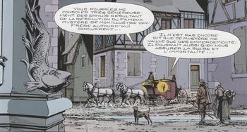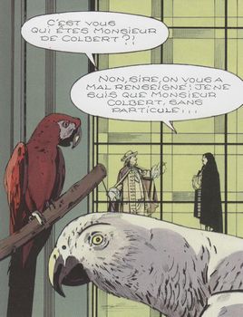 remarques: | 5ème volet de la série, novembre 1998 avec les portraits en page de garde le masque de fer se souvient toujours encore: (et c'est vraiment une histoire très embrouillée) >> p. 4/5 1661, Mazarin se sachant empoisonné fait ses adieux à sa collection d'oeuvres d'art (ses merveilles accumulées), mais il veut que son trépas soit aussi son triomphe, avant de mourir, il met la lettre de Louis XIII en sécurité et fait jurer à la reine-mère de ne rien entreprendre contre Molière, Louis XIV sera le roi des français et Molière le roi des comédiens - mort de Mazarin (le faquin) qui n'est pas dupe et qui sait qu'il meurt empoisonné par la reine-mère, mais il aura su garder son secret - Louis XIV est âgé de 23 ans, il ne veut plus de premier ministre, il veut règner seul - Fouquet reste superintendant des finances, mais le roi nomme Colbert, inspecteur des finances pour contrôler les comptes de Fouquet - mariage d'Henriette d'Angleterre avec Monsieur, Philippe d'Orléans, frère du roi bien que celui-ci ait des sentiments dans le travers Henriette devient la maîtresse de Louis XIV qui, pour détourner les soupçons, courtise la boiteuse Louise de Lavallière et bientôt Henriette sera délaissée au profit de de Lavallière - la reine-mère s'allie avec Colbert pour renverser Fouquet, la De Lavallière devient la maîtresse du roi >> page 46 "on vit alors la mère et la femme du monarque lui reprocher d'être infidèle à sa belle-soeur (la vie est un théâtre) - sur conseil de la reine-mère, le roi demande à Fouquet de lui faire visiter son nouveau château de Vaux, "le magnifique château des merveilles" et Fouquet va se perdre en en faisant trop >> un assez bon album tant pour le graphisme que pour le scenario en partie ironique et souvent historique, représentant les intrigues règnant à la cour du roi-soleil |