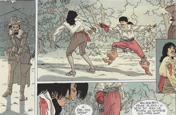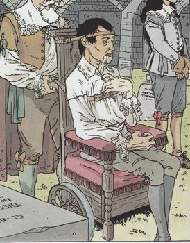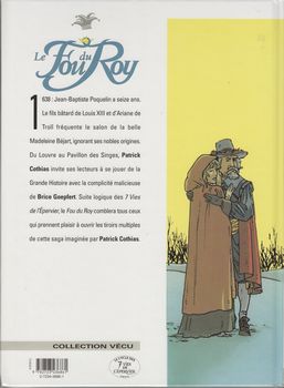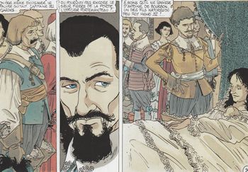 remarques: | troisème volet de la série, mai 1996, avec les portraits en page de garde - Paris 1638, Richelieu semble être en bon terme avec Gaston d'Orléans et peu de monde connaisse vraiment l'origine de Jean-Baptiste >> p. 6/7 le monde des comédiens - néanmoins Gaston charge son favori Modène de le débarrasser secrètement de Jean-Baptiste en l'empoisonnant, mais c'est le curé et poète Scarron qui sera frappé, il y survivra, mais restera infirme à vie - toutefois, la grossesse inopinée de la reine met fin aux attentats perpétués contre Jean-Baptise et le roi n'est pas dupe en prétendant que la conception de la reine n'est pas de son ressort, un héritier reste malgré tout un héritier lui conseille Richelieu et Louis XIII accepte finalement de reconnaître l'enfant bien que ce ne soit pas lui qui a "rembourré" la reine >> p. 20 Cinq-Mars entre comme maître de la garde-robe de l'auguste majesté grâce à l'entremise de Richelieu, toutefois il trahira peu après le cardinal en se mettant au service de Gaston d'Orléans qui lui, malgré l'ordre du cardinal de ne intervenir, ordonne à Cinq-Mars de se débarrasser à nouveau de Jean-Baptiste - Cinq-Mars tente alors de provoquer Jean-Baptiste en duel, mais celui-ci sera protégé par Modène qui a changé de bord et à la place de Jean-Baptiste, c'est Modène qui déculotte Cinq Mars >> p. 25 courte apparition de Cyrano de Bergerac >> p. 28/29 les duels entre Jean-Baptiste, Cinq-Mars et Modène - septembre 1638, naissance de Louis Dieudonné, Gaston d'Orléans décide de ne plus rien tenter contre Jean-Baptiste et plutôt de l'utiliser si son frère meurt en soulevant la possibilité de prétendre la succession à Jean-Baptiste - le grand-père de Jean-Baptiste lui annonce qu'il n'est pas son vrai grand-père, mais il sera assassiné avant de pouvoir en dire plus - et Jean-Baptiste restera avec une grande question: pourquoi m'a-t-il dit "je ne suis pas ton grand-père" >>> un album bien dessiné et surtout bien raconté, surtout concernant les intrigues de cour et le jeu subtil des complots à la cour avec description des personnages Information a) Marion de Lorme, est une courtisane (1613-1650), troisième maîtresse de Richelieu, liée avec Ninon de Lenclos, elle partagea avec elle les suffrages de tout ce que Paris avait de plus galant et de plus spirituel, elle résidait dans le même quartier, le Marais, place Royale, plus jolie que Ninon, plus ardente, elle était dotée de moins d'esprit b) Antoine de Bourbon-Bueil, comte de Moret (1607-1632) est le fils qu'Henri IV eut avec Jacqueline de Bueil, quelques romans postérieurs ont fait du comte le père de Louis XIV (à ne pas confondre avec Antoine de Bourbon, père d'Henri IV) c) Armand de Bourbon, prince de Conti (1629-1666), est le dernier des trois enfants d'Henri II de Bourbon, prince de Condé et de Charlotte Marguerite de Montmorency, il est le frère du "Grand Condé", c'est un descendant de Saint-Louis d) baron de Modène, chambellan de Gaston d'Orléans, probablement un personnage fictif bien qu'il y ait eu un Henri de Raymond, seigneur puis marquis de Modène (1656-1723) qui fut officier de marine français et cepitaine général des garde-côtes de la Méditerranée e) Georges de Scudéry (1601-1667) était un romancier, dramaturge et poète français, il avait soin de dédier ses œuvres aux personnages les plus considérables, particulièrement à Richelieu, ce fut lui qui donna le signal de la levée de boucliers contre Corneille après la représentation du Cid f) Paul Scarron (1610-1660) est un écrivain, contemporain du règne de Louis XIII et du début de Louis XIV, son ouvrage le plus connu est le roman comique; en 1638, il est atteint d’une maladie qui finit par lui paralyser les jambes, la colonne et la nuque, il n’est plus qu’un corps, tordu et perclus, immobilisé dans un cul-de-jatte (mot qu'il emploie avec le sens de sorte de jatte servant à ceux qui n'ont plus l'usage de leurs jambes), en 1652, à 42 ans, il épouse une orpheline sans fortune âgée de seize ans Françoise d'Aubigné, future Madame de Maintenon n.b. jatte = récipient de forme arrondie, très évasé, sans rebord ni anse g) Savinien de Cyrano, dit de Bergerac (1619-1655) est un écrivain français et formidable bretteur, il était doté d'un très grand nez et de beaucoup d'esprit, son diptyque romanesque: "les états et empires de la lune et du soleil" est un des premiers romans de science-fiction n.b. diptyque = oeuvre littéraire ou artistique en deux parties |