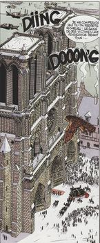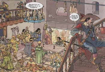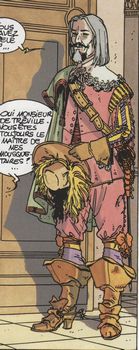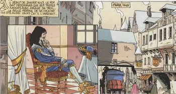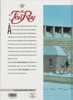 remarques: | cinquième volet de la série, janvier 1998 avec toujours les portraits en page de garde - Paris 1643, sous le déguisement de masque rouge, Louis XIII cherche à faire éclater la vérité et veut reconnaître Jean-Baptiste comme son héritier, mais il se demande si c'est vraiment dans l'intérêt du royaume - de son côté, Jean-Baptiste décide de quitter définitivement l'atelier de son père qu'il sait ne pas être son père et se vouer entièrement au théâtre - la reine ordonne à ses sbires de liquider Jean-Baptiste, celui-ci échappe à plusieurs attentats dont un à la bombe - Louis XIII ordonne à ses mousquetaires de protéger Jean-Baptiste, il veut convoquer Jean-Baptiste, mais celui-ci ne parvient pas à atteindre le roi - pour arriver à leurs fins, Gaston d'Orléans propose à la reine d'empoisonner le roi >>p. 45 apparition d'Artagnan >>> l'action se précise et le graphisme s'affirme, un album de bon aloi bien que quelque peu farfelu annexes - 1er et 2me plat de l'album - diverses illustrations dont Louis XII, un mousquetaire, Notre-Dame de Paris et une taverne de l'époque |