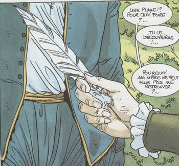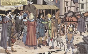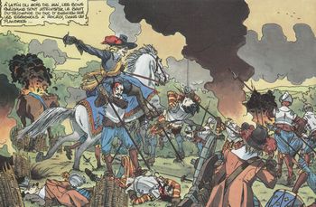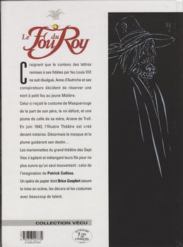 remarques: | 7ème volet de la série, août 1999 avec toujours les portraits en page de garde - fin mai 1643, Louis XIV n'a que cinq ans et règne sous la tutelle de sa mère et de Mazarin, tandis que Jean-Baptiste a reçu le masque de la tragédie - Treville, chef des mousquetaires, informe la reine de s'en tenir aux conditions fixées par le roi concernant Poquelin, mais la reine oeuvre à un nouveau plan: empoisonner le bâtard, toutefois Mazarin intervient auprès de la reine et lui explique toute l'affaire ((qui n'est d'ailleurs qu'un secret de polichinelle) et celle-ci renonce à son projet, la surveillance de Jean-Baptiste est alors interrompue, seul d'Artagnan continue sa protection à titre privé, car, lui, a deviné toute la vérité - Jean-Baptiste apprend que Ariane de Troïl avait un frère Guillemot qui pourrait se trouver au château familial arrivé à Aurillac, il apprend de Gabriel de Troïl (un revenant mentionné brièvement?) que Guillemot est mort et enterré >> p. 33 visite à Aurillac et retour sur la tragédie de Blanche de Troïl >> p. 36 rencontre aussi avec un ancien habitant d'Aurillac (Leonard Langue-Agile) qui donne à Jean-Baptiste son nom de théâtre: Molière, que Jean-Baptiste adopte avec le masque et la plume >> p. 40 Jean-Baptise devient comédien et jouera ses rôles définitivement avec le pseudonyme de Molière, il constitue son équipe sous le nom de l'illustre théâtre, tandis que Gaston d'Orléans commence à s'intéresser aux gens de théâtre et de lettres >>> la série reste toujours encore intéressante mais le scénario commence à montrer des signes de langueur et d'épuisement, le graphisme restant respectable |