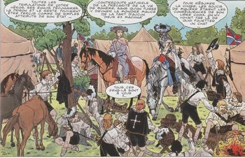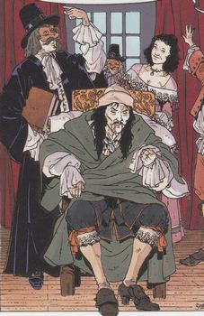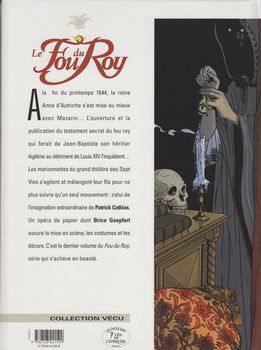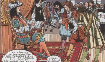 remarques: | dernier album de la série, janvier 2004 et sans la page de garde aux portraits - printemps 1644, la reine-mère est au mieux avec Mazarin, tandis que Monsieur complote à son habitude, il veut faire enrager Molière sans en avoir l'air en le mettant au régime de la douche écossaise, alors que le clergé critique et censure les pièces de Molière, de plus des ennuis financiers affectent l'illustre théâtre qui fait faillite et la troupe se disperse >> p. 5 la partie de jeu de croquet menée par Gaston duc d'Orléans >> page 48 Molière serait le demi-frère de Ninon Lenclos - 1650, début de la Fronde, départ et retour de Mazarin, d'Artagnan est devenu chef des mousquetaires à la place de Tréville, Molière rédige maintenant lui-même ses pièces de théâtre, mais il reste encore méconnu durant 8 ans - 1658 Molière revient sur la scène grâce à l'intérêt que lui porte le jeune Louis XIV qui met à la disposition de Molière la salle du Palais-Royal où Molière y jouera jusqu'à son dernier jour - 1660 mort de Monsieur Gaston et en 1661 celle de Mazarin, Louis XIV veut règner en monarque absolu, Fouquet est arrêté >> page 26 mention de "Donjon" (voir la série du masque de fer) - en 1662 Molière quitte Madelon pour épouser Armande (fille de Madelon qui pourrait bien être aussi sa propre fille), il a de nombreux ennemis, mais le roy le soutient toujours encore - en 1665, la pièce "Tartuffe" est interdite, Molière tombe malade, la reine sur le point de mourir, confesse à son fils Louis quelque vérité sur Molière sans préciser sa paternité, elle demande toutefois au roy de bien protéger Molière - 1666 mort d'Anne d'Autriche, Louis XIV ordonne d'enquêter sur Molière et apprend l'affaire des poisons avec la femme Le Voisin >> p. 34 petite dissertation sur les pièces de théâtre de Molière >> p. 35 Louis XIV apprend la vraie origine de Molière par la duchesse de Beauvais (surnommée Cathau la borgnesse), confidente de la reine et première maîtresse de Louis XIV, avant de mourir en 1672, celle-ci lui révèle que Molière est le demi-frère du roy - Louis XIV se désintéresse alors de Molière et cherche même à s'en débarrasser secrètement Molière est drogué par une religieuse inconnue, il est fiévreux et mal en point, décide malgré tout de jouer sur scène son dernier rôle dans "le malade imaginaire" - il est emporté mourant et on le dit mort le 17 février 1673, mais le scénariste continue l'histoire de Molière, il aurait été guéri et on aurait échangé les cercueils, Molière serait alors devenu sur ordre de Louis XIV le fameux masque de fer et Ninon Lenclos persuade d'Artagnan de retrouver et de délivreer le prisonnier n.b. toute cette dernière partie de l'album est racontée par d'Artagnan à Ninon Lenclos lors d'un entretien personnel, ce sera le testament d'Artagnan remarques il y a eu déjà tellement de suppositions sur l'identité du masque de fer qu'une hypothèse de plus ou de moins, ne changera pas le mystère qui entoure le masque de fer, toutefois pour le lecteur intéressé, l'histoire continue quelque peu dans la série du masque de fer (6 albums de 1991 à 2001) >>> voir ce titre >>> une fin assez appropriée mais quelque peu en contradiction avec la série du "masque de fer", scenario et graphisme restant malgré tout assez intéressant pour ce dernier volume n.b. la série du fou du roy est peut'être à lire avant celle du "masque de fer", mais de toute façon l'identité du masque de fer restera très fictive dans les deux séries annexes - 1er et 2ème plat de l'album - diverses illustrations |