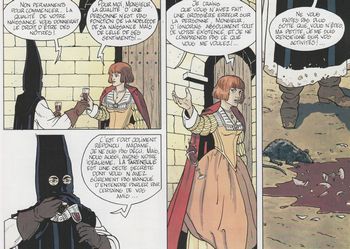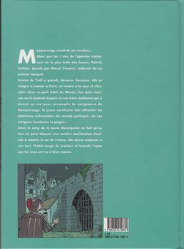 remarques: | 5ème volet de la série, décembre 1991, sans la page de garde aux portraits la série Masque Rouge continue 7 ans plus tard m^me scénariste mais avec le dessinateur Marco Venanzi qui n'arrivera toutefois pas à égaler le graphisme de Juillard, malgré un style assez proche de Juillard Ariane se fait enlever par la secte de l'araignée et le grand-maître lui demande soit d'intégrer la secte soit de livrer masque rouge, bien sûr Ariane refuse, il en résultera une lutte à mort contre les membres de la secte: le prévôt Torchepot, la vicomtesse de Tetra-Lyre et le chevalier Rodomont de Rougequeue qui est le grand maître, qui s'est épris d'Ariane et se suicidera à la fin du récit >> p. 32 mort des deux fils Bruantfou trucidés par le masque rouge n.b. on apprend aussi que Taillefer (l'ex-lieutenant du comte de Bruantfou) aurait été durant un temps le masque rouge, mais selon la série masque rouge, Taillefer aurait été supprimé par les sbires de Bruantfou (1991), alors que l'on retrouve Taillefer dans la série plume-aux-vents (1995), bizarre affaire >> rien de très particulier à signaler dans cet album |