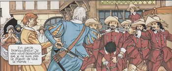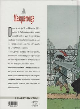 remarques: | 9ème volet de la série, album juin 2000 à nouveau une page de garde aux portraits - 1622, en campagne militaire, le roi pressent que quelqu'un qui lui est cher à un grand besoin de lui dans la capitale Ariane met son nouveau-né au monde, mais se le fait enlever peu après et ni le roi ni Grandpin n'en sont au courant >> p. 13 rencontre d'Ariane avec Marie de Rohan, veuve du duc de Luynes, mais dame de compagnie fidèle à la reine qui défie Ariane en duel et qui le regrettera >> p. 21 fin de la campagne militaire du roi, entrée du roi à Paris accompagné du prince de Condé, son nouveau favori, Richelieu devient cardinal >> p. 20 répandre du fumier dans les rues de Paris en hiver pour empêcher les chevaux de glisser sur la glace Ariane veut rencontrer le roi, mais la duchesse de Chevreuse (Marie, la veuve de De Luyne) lui conseille de n'en rien faire si Ariane tient à la vie de son fils >> p. 31 déroulement des évènements en France de janvier à août 1622 >> p. 42 Leonard Langue-Agile rencontre Ariane et lui dit que son destin est désormais tracé comme justicier sous l'apparence du masque rouge, elle reverra aussi son fils, mais seulement dans cinquante ans >> un album dans la moulure des précédents, assez intéressant tant pour le scénario que pour le graphisme n.b. cet album aurait dû s'intituler le fils d'Ariane, mais ce sera finalement la veuve noire, cependant le titre le fils d'Ariane sera repris dans le dernier album (2022 3ème époque) de la série des 7 vies de l'épervier nomenclature - aphorisme = bref énoncé résumant une théorie ou un savoir - truisme = vérité d'évidence - adage = maxime ancienne et populaire Information Jean Héroard (1512-1628) est un médecin, vétérinaire et anatomiste français, il est mort durant le siège de La Rochelle il fut médecin du roi et a écrit un journal donnant au jour le jour tous les évènements pouvant influer sur la santé de Louis XIII ainsi qu'un ouvrage qui le place parmi les pionniers de l'art vétérinaire des chevaux |