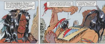 remarques: | album dédicacé par Dethorey et Cothias après avoir franchi l'Atlantique, Grandpin arrive à Tadoussac à l'entrée du Saint-Laurent (que les indiens nomment le chemin qui marche), puis à Fort Québec où il entend parler du chevalier Condor qui n'a qu'un oeil et qu'un bras (mais ce n'est pas le bras droit qui est amputé, erreur p. 17) Grandpin part de suite à sa recherche vers les Trois-Rivières avec le père Bréboeuf, un brave prêtre-missionnaire, Grandpin rencontrera brièvement le chevalier Condor qui le débarrasse de trappeurs hors-la-loi, Condor lui annonce que Ariane est bien sa fille, mais qu'il doit encore livrer un important combat? puis il s'évapore dans la nature >> p. 30 le supplice des maringouins = gros moustiques dans la région de Québec >> un assez bon début dans ce nouveau cycle des 7 vies de l'épervier (coeur brûlé) il y aura 7 albums, ce qui sera bien assez, un premier album avec le graphisme particulier de Dethorey, mais assez original et un bon scenario de Cothias qui va toutefois se perdre dans l'immensité de la Neuve-France Information Dethorey et Cothias avec cette fresque naturaliste et grandiose, s'engouffrent dans l'immensité du Nouveau-Monde, recréent les traditions des tribus indiennes et le mode de vie des colons, ils unissent leurs talents pour livrer un chapitre inédit de l'histoire de Germain Grandpin, ancien commandant de la garde d'Henri IV et compagnon d'aventures et de ripailles d'un justicier qui, en d'autres temps et d'autres lieux, se fait appeler l'Epervier si le graphisme de Dethorey est encore assez intéressant dans les deux premiers volumes, le dessin de Meral qui continue la série durant les cinq autres albums ne sera pas trop recherché, tandis que les scénarios de Cothias voguent dans les caprices de Chemin-qui-Marche (= le Saint Laurent) la Gaspésie (page 11) est une péninsule située au centre-est du Québec, à l'est de la vallée de la Matapédia, et entourée des eaux de l'estuaire du Saint-Laurent au nord, du golfe du St-Laurent à l'est et de la baie des Chaleurs au sud, le nom de Gaspésie est un dérivé du mot Gaspé qui est un dérivé du terme micmac Gespeg signifiant "fin des terres" |