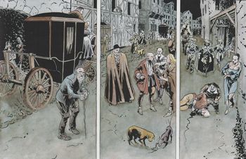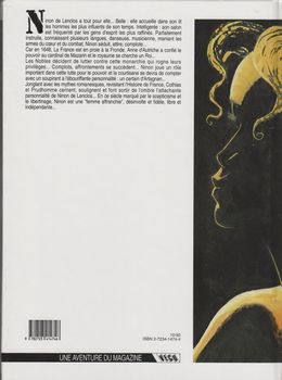 remarques: | une série de 6 albums faisant partie de la saga des 7 vies de l'épervier, 1er volet de la série, septembre 1992 sans la page de garde aux portraits - 1648, début de la Fronde sous Mazarin, le salon de Ninon Lenclos rassemble beaucoup de personnalités dont Coulon, président du Parlement, qui commandite Ninon, celle-ci était l'amie mais non l'amante de Richelieu au contraire de Marion de Lorme - en ce siècle marqué par le scepticisme et le libertinage, Ninon est une "femme affranchie", désinvolte et fidèle, libre et indépendante >> p. 24/25 duel entre Ninon et Anne de Longueville, soeur du prince de Condé, ceci pour une affaire d'honneur - Mazarin charge d'Artagnan de séduire Ninon afin de faire basculer celle-ci dans le camp du cardinal >> p. 42-45 l'évasion rocambolesque du duc de Beaufort - et en dernière page, apparition insolite de Léonard Langue-Agile avec son bouc >> un début assez intéressant avec un graphisme quelque peu spécial de David Prudhomme et et une couverture d'album bien exécutée Information A) Anne Ninon de l'Enclos, aussi appelée Ninon de Lenclos (1620-1705) est une courtisane, femme d'esprit, épistolière et femme de lettres française n.b. épistolière = personne qui excelle à écrire des lettres - fille d’Henri de Lenclos (gentilhomme tourangeau libertin) et de Marie-Barbe de la Marche, Ninon se révèle une enfant prodige au luth qui citait Montaigne et les grands classiques - Ninon de Lenclos devint une femme de lettres, influencée par les idées épicuriennes, qui savait l'italien et l'espagnol tout en étant versée en sciences, en 1642, à la mort de sa mère, son libertinage et son athéisme affirmés alors que sa respectabilité n'est pas encore acquise font que les grandes dames du salon du Marais se détournent d'elle, si bien qu'elle vient habiter chez une autre courtisane, Marion Delorme, qui devient son professeur - la belle et intelligente Ninon a, sa vie durant, collectionné une ribambelle d'amants dont le Grand Condé, le comte d'Aubijoux, François de La Rochefoucauld, le maréchal d'Estrées à tel point que Walpole la surnomma plus tard Notre-Dame des amours n.b. Horace Walpole= écrivain anglais - elle classait ses amants en payeurs, martyrs (soupirants sans espoir) et caprices (élus du moment), elle eut des enfants dont un fils, le chevalier Louis de la Boissière, qui deviendra brillant officier de marine - proche de Molière, elle corrigea, à la demande de l'auteur, la première version du Tartuffe - inquiétée par le parti, elle fut enfermée en 1656 sur ordre d'Anne d'Autriche aux Madelonnettes, puis dans un couvent de Lagny - tenant un salon à partir de 1667, elle acquit la respectabilité lorsqu'elle fut admise dans celui de Marguerite de la Sablière en 1677 - grand amateur de sagesse, Louis XIV se préoccupait souvent, par personne interposée, de l'opinion de Ninon, le jour de ses 77 ans, Ninon eut une aventure avec l'abbé de Châteauneuf, à la même époque, elle mène de front une autre liaison avec le chanoine Nicolas Gédoyn, - quelques mois avant son décès, à près de 85 ans, elle se fit présenter le jeune Arouet (Voltaire) alors âgé d'environ 11 ans et élève du collège jésuite de Paris, dans son testament, elle lui légua 2 000 livres tournois (l'équivalent de 7 800 € de l'an 2008) pour qu'il pût s'acheter des livres (un journalier gagnait alors 300 livres tournois par année n.b. contrairement à Marion Delorme, il ne semble pas que Ninon Lenclos eut des relations intimes avec Richelieu B) Marie de Lon, demoiselle de Lorme dite Marion de Lorme est une courtisane française (1613-1650) - née dans une famille de la noblesse de robe (son père, mort en 1639, était président et trésorier général des finances en Champagne), elle fut élevée à Baye, elle apprit la danse et la musique, elle était riche et belle, "pieuse et même mystique" - c'est alors qu'arriva au logis, en tant que maître d'écriture, le poète Des Barreaux qui devint son premier amant, elle le délaissa pour Cinq-Mars ce dont Louis XIII se montra jaloux, elle eut des liaisons sentimentales ou vénales avec le duc de Buckingham et plusieurs jeunes seigneurs de la cour - Guy Patin écrit en 1649: "la troisième maîtresse du cardinal de Richelieu était une certaine belle fille parisienne, nommée Marion de Lorme, que M. de Cinq-Mars avait entretenue, comme l'a fait aussi le maréchal de La Meilleraye et plusieurs autres" - liée avec Ninon de Lenclos, elle partagea avec elle les suffrages de tout ce que Paris avait de plus galant et de plus spirituel, elle résidait dans le même quartier, le Marais, place Royale, - plus jolie que Ninon, plus ardente, elle était dotée de moins d'esprit, après l'arrestation des princes de Condé et de Conti pendant les troubles de la Fronde, elle fut sur le point d'être arrêtée elle-même; mais sa mort inopinée empêcha l'exécution de l'arrêt, elle aurait succombé, âgée de 36 ans, à la prise d'une trop forte dose d'antimoine n.b. antimoine = genre d'arsenic |