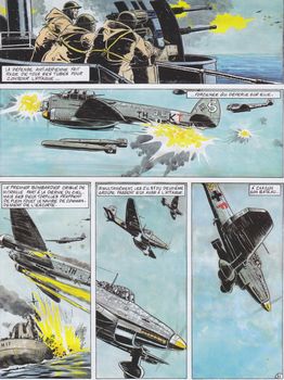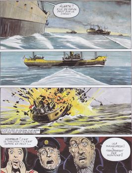 remarques: | l'histoire d'un convoi de 57 cargos et neuf escorteurs partis de New Waterport (Nova Scotia) à destination de Mourmansk le convoi sur la route arctique est harcelé par les U-Boote et la Luftwaffe au large de la côte nord de Norvège >> p. 23 la tactique des U-Boote (la meute) et celle des escorteurs du convoi >> p. 34 une proie idéale pour les Stukas >> pas le meilleur des albums de Dimitri, mais scénario et graphisme très respectables avec une jolie couverture d'album n.b. >>> biographie Guy Mouminoux alias Dimitri voir CBD no 63 (Adèle Blanc-Sec), ainsi que dossier auteurs BD Dimitri 462D2+E Information fin 1941, sur les quais encombrés de New Waterford (Nova Scotia) des centaines de bâtiments sont affrétés pour assurer les grands convois qui vont ravitailler la guerre à l'autre bout du monde; sous la protection de l'U.S. Navy, 57 cargos, chargés à ras bord de matériaux, de munitions y compris de nombreux tankers accompagnés de neuf escorteurs, s'avancent sur l'océan pour une longue traversée qui doit les mener en URSS Alttrup, héros malgré lui de cette histoire tragique, fait partie de l'équipage du Viborg, navire transportant 2500 tonnes de carburant et 2000 fûts d'huile, le convoi est en proie aux attaques allemandes et les sous-marins ennemis ne tardent pas à se manifester, coulant méthodiquement plusieurs navires, dans le chaos et la panique générale, en plus des attaques de la Luftwaffe, il faut s'organiser pour survivre dans les eaux froides de l'Arctique avec ce récit, Dimitri nous fait partager une fois de plus les horreurs de la guerre |