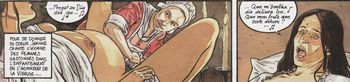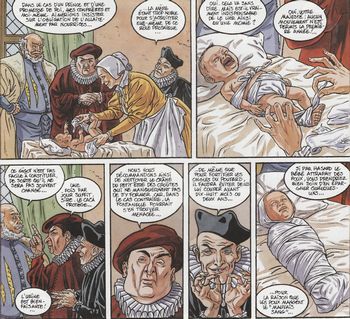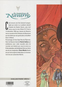 remarques: | série en prélude aux 7 vies de l'épervier, janvier 1999 mais antérieure à la série du chevalier, la mort et le diable; la présentation et la narration sont faites par Leonard Langue-Agile avec un commentaire sur dieu et le diable, le diable qui est le bouc émissaire des hommes >> p. 6 référence à la série des 7 vies de l'épervier en Bearn, naissance le 12.12.1553 du petit Henri de Navarre, fils de Jeanne de Navarre et d'Antoine de Bourbon >>> p. 13 la naissance d'Henriquet l'histoire de Jeanne de Navarre, fille unique d'Henri d'Albret, roi de Navarre et de Marguerite d'Angoulême, 2ème épouse d'Henri d'Albret, Jeanne, fille chétive et taciturne, sera appelée durant son enfance Jeanne-la-Pleureuse en France, Henri II a succédé à François Ier, pour éviter une alliance Espagne-Navarre contre la France, Henri II donne son neveu Antoine de Bourbon en mariage à Jeanne de Navarre, celle-ci s'en accomodera très bien et deviendra même Jeanne-la Rieuse 1554 baptême d'Henriquet, 1555 mort de son grand-père à 53 ans, Henri devient prince de Navarre surnommé "Nostre Henric", présenté à la cour de Henri II, Henriquet fait la connaissance de trois femmes qui vont influençer sa vie: 1) Catherine de Medicis, épouse de Henri II 2) Diane de Poitiers, maîtresse de Henri II 3) Marguerite de Valois, fille d'Henri II Jeanne de Navarre adopte la foi réformée de Calvin, François II premier fils d'Henri II est fiançé à Marie Stuart, le 2ème en ligne est Charles IX, puis Henri d'Anjou (Henri III) et François due d'Alençon qui mourra avant Henri III Henri de Navarre est fiançé à Marguerite par Henri II, ce qui ne plait pas du tout aux Guise qui dominent la scène politique, mais le sort en est jeté par Léonard Langue-Agile >> p. 25 la mise en condition des bébés de cette époque, du moins dans la noblesse >> p. 34 la devise du château de Coarraze: lo que ha de ser no puede faltar = ce qui doit arriver ne peut pas manquer >> royalement et formidablement raconté par Cothias, un parfait exposé historique par la BD et le graphisme de Wachs est très bien exécuté (il avait d'ailleurs participé au graphisme du "triangle secret"), à noter: une couverture bien exécutée, le récit de l'album se termine en l'an 1557 Information A) Henri II d'Albret, roi de Navarre (1503-1555), en fait il n'était roi que de la Basse Navarre, la Haute Navarre avec Pampelune était territoire espagnol, marié à Marguerite d'Angoulême, soeur aînée de François Ier dont il sera donc le beau-frère et grand-père d'Henri IV, a) une fille Jeanne de Navarre, dite la Pleureuse puis la Rieuse en épousant Antoine de Bourbon b) un fils Jean, mort-né B) Jeanne de Navarre (1528-1572) épouse Antoine de Bourbon (1518-1562), enfants: le futur Henri IV et Catherine de Bourbon, dite la boiteuse qui deviendra l'épouse de Henri de Lorraine, (les autres enfants dont Henri, duc de Beaumont mourront très tôt) C) le frère de Antoine de Bourbon: Louis Iᵉʳ de Bourbon, prince de Condé, duc d'Enghien, est un prince du sang de la maison de Bourbon et le principal chef protestant durant les trois premières guerres de religion, il meurt assassiné sur le champ de bataille de Jarnac, il est le fondateur de la maison de Condé D) Henri II, roi de France (1519-1559), fils de François Ier et de Claude de France, épouse Catherine de Médicis, mais Diane de Poitiers restera sa fameuse maîtresse, ses enfants: a) Diane de France, duchesse d'Angoulême (1538-1619), épouse François de Montmorency, son personnage apparait dans le livre d'Alexandre Dumas: les Deux Diane n.b. elle est fille naturelle du dauphin Henri (le futur Henri II) et de Filippa Duci, une piémontaise, elle est élevée par la favorite Diane de Poitiers b) François II, fils aîné (1544-1560), ne règnera qu'un an après avoir épousé Marie Stuart, fille de Jacques V et de Marie de Guise c) Elisabeth de France (1545-1568) 3ème épouse de Philippe II d'Espagne n.b. sous le nom d'Élisabeth de Valois, elle est un des personnages principaux du grand opéra Don Carlos de Giuseppe Verdi inspiré de la pièce de théâtre homonyme de Friedrich von Schiller d) Claude de France (1547-1575), 2ème fille d'Henri et de Catherine n.b. elle est duchesse de Lorraine et de Bar par son mariage avec le duc Charles III, duc de Lorraine et de Bar (état alors indépendant du royaume de France) e) Louis de France (1549-1550) mort prématurément f) Charles IX (1550-1574), roi de France (1560-1574), marié à Elisabeth d'Autriche, sans enfant mâle légitime n.b. son règne déboucha sur le massacre de la Saint-Barthélemy g) Henri III (1551-1589), roi de France (1574-1589), il fut roi de Pologne de 1573 à 1575, il meurt assassiné par le moine Jacques Clément, épouse Louise de Lorraine n.b. il est cité dans le roman les quarante-cinq (garde personnelle du roi) d'Alexandre Dumas, il eut ses favoris appelés "mignons", le roi Henri III demeurant toujours sans descendance, la disparition du duc d'Anjou permit au protestant Henri de Navarre (futur Henri IV) de devenir l'héritier direct de la couronne de France h) Marguerite de Valois, surnommée Margot (1553-1615), première épouse de Henri IV, aucun enfant ij) François de France (1555-1584), mort de tuberculose avant son frère Henri III, il ne règnera pas, surnommé le Malcontent, prétendant de la reine Élisabeth Ière d'Angleterre de 1572 à sa mort, il ne se maria jamais k) Victoire de France (1556, ne vivra que trois mois l) Jeanne de France (1556, double naissance, mort-née) E) François de Lorraine, duc de Guise (1519-1563), surnommé le Balafré, chef du parti catholique, il avait épousé Anne d'Este, une princesse franco-italienne, il meurt pendant le siège d'Orléans d'un coup de pistolet tiré par un gentilhomme protestant, Jean de Poltrot de Méré n.b. son frère Charles de Lorraine (1524-1574) devient archevêque de Reims puis de Metz a) son fils Henri de Guise (15